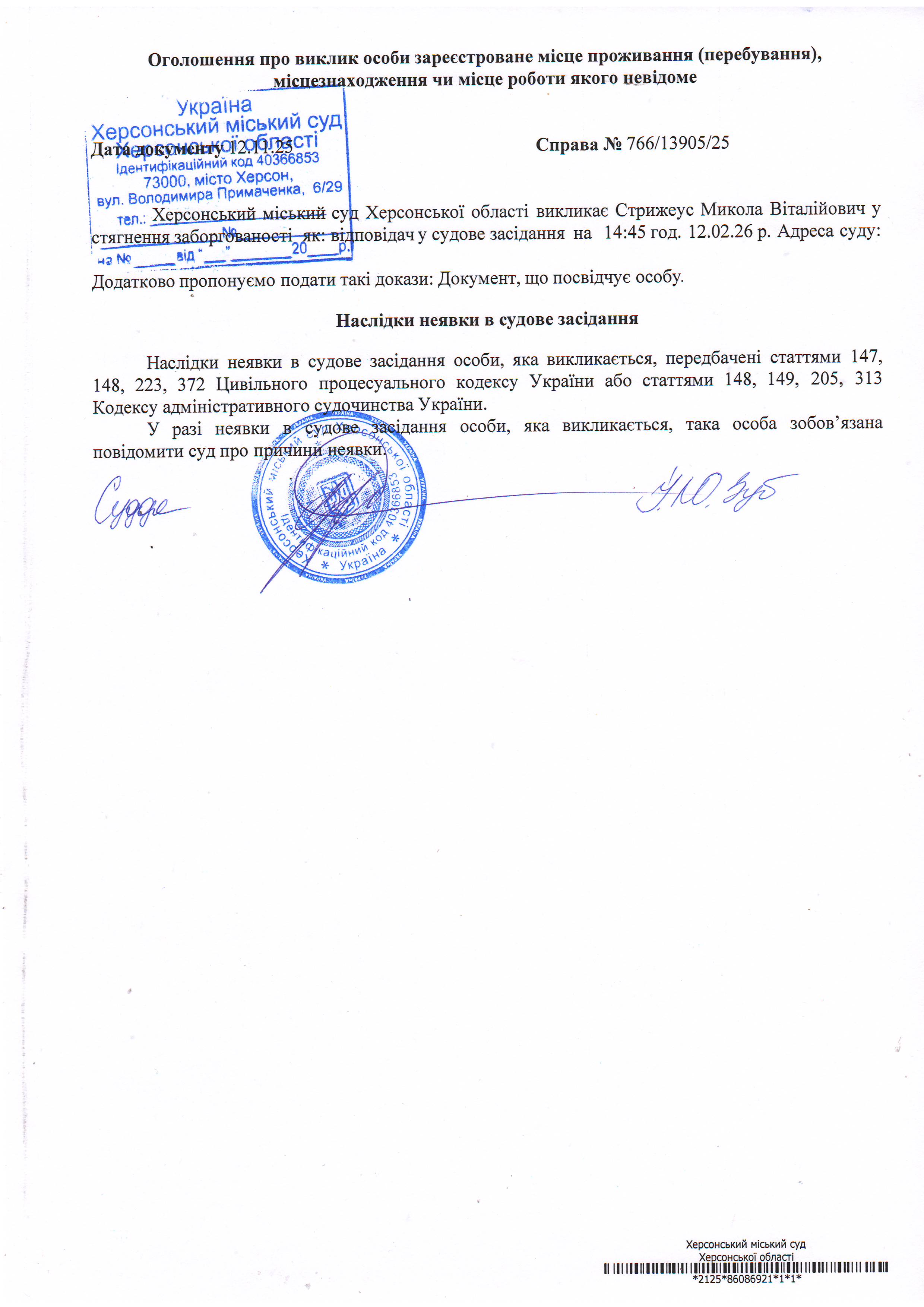 ОГОЛОШЕННЯ ПРО ВИКЛИК ДО СУДУ