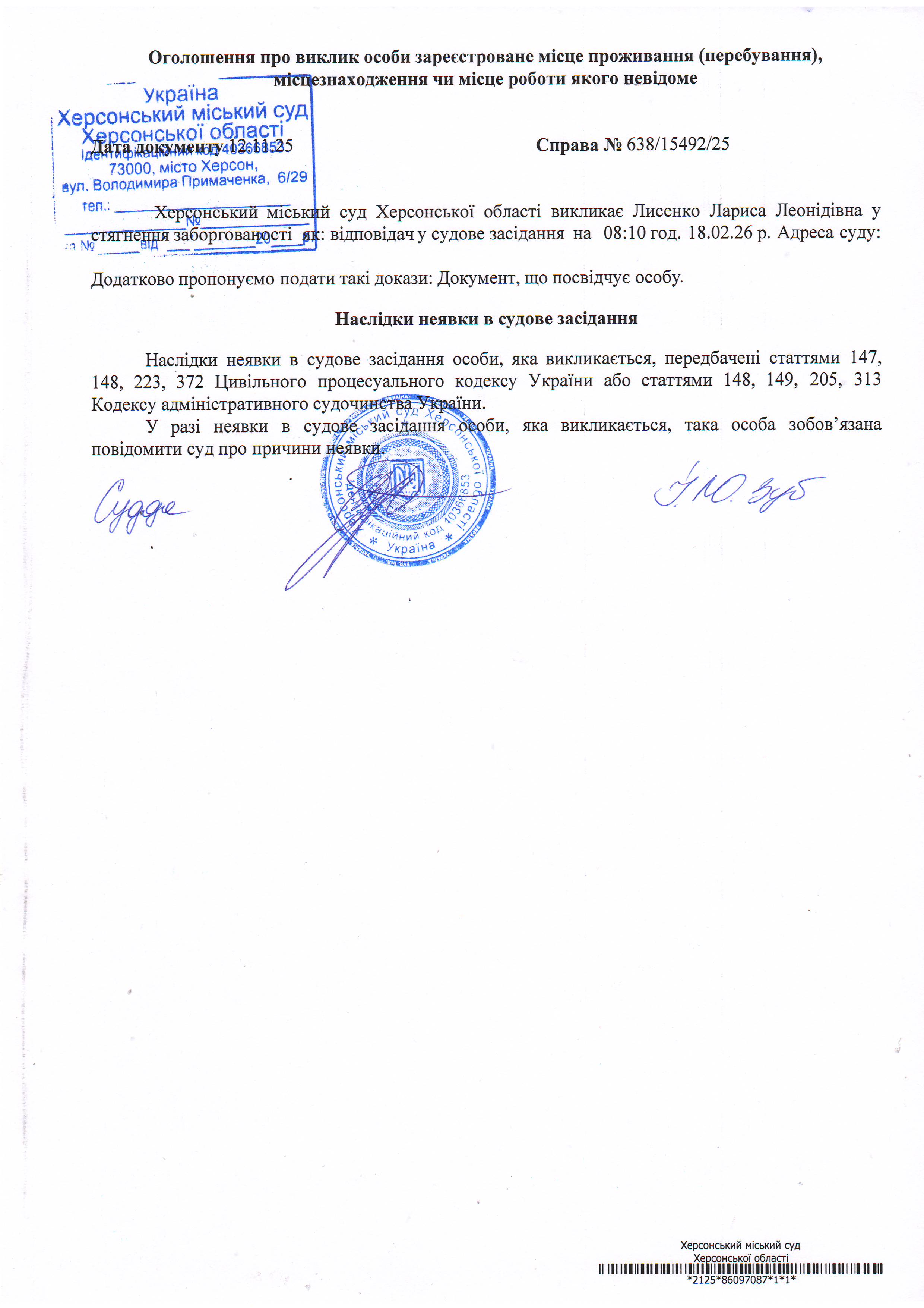 ОГОЛОШЕННЯ ПРО ВИКЛИК ДО СУДУ