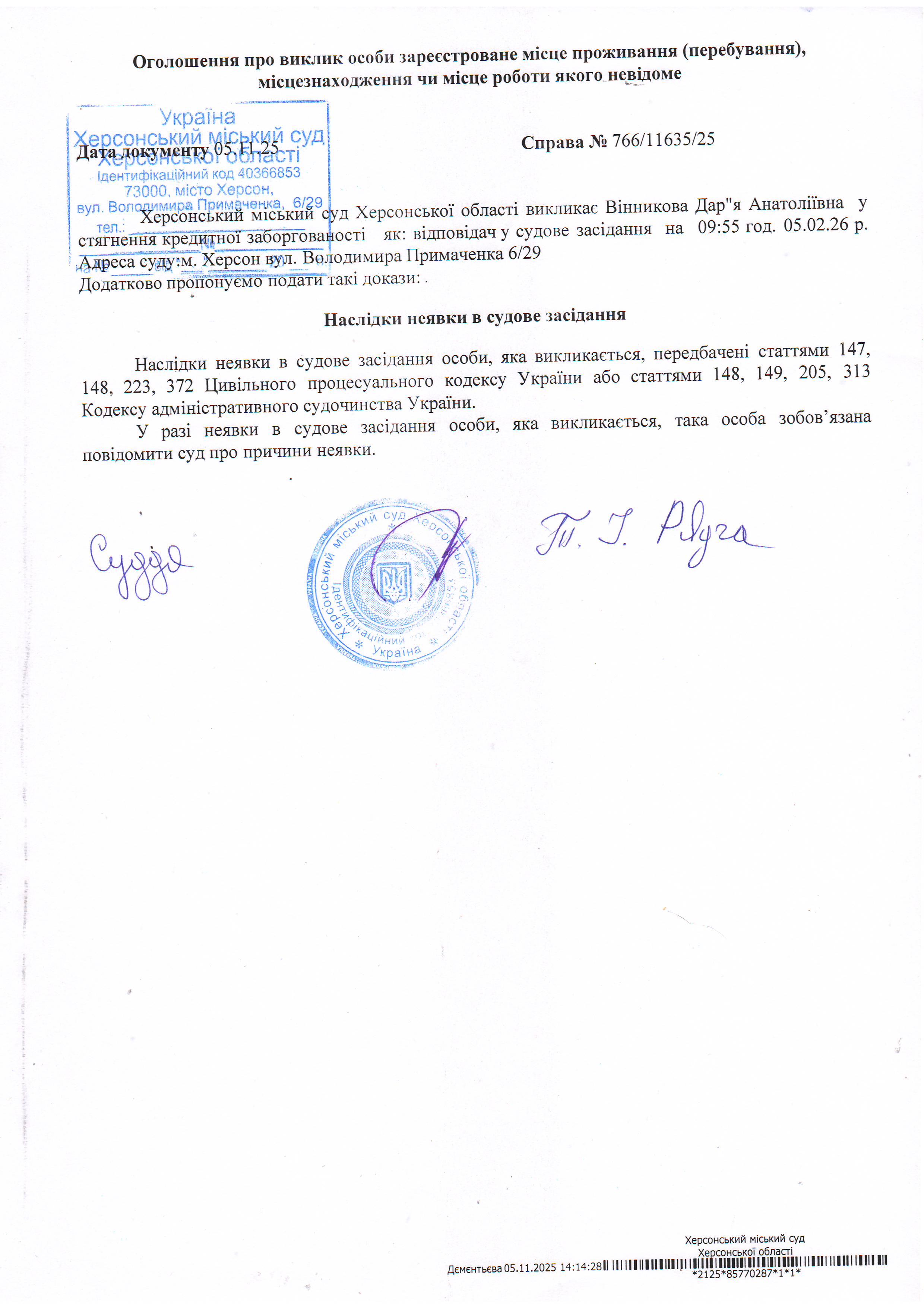 ОГОЛОШЕННЯ ПРО ВИКЛИК ДО СУДУ