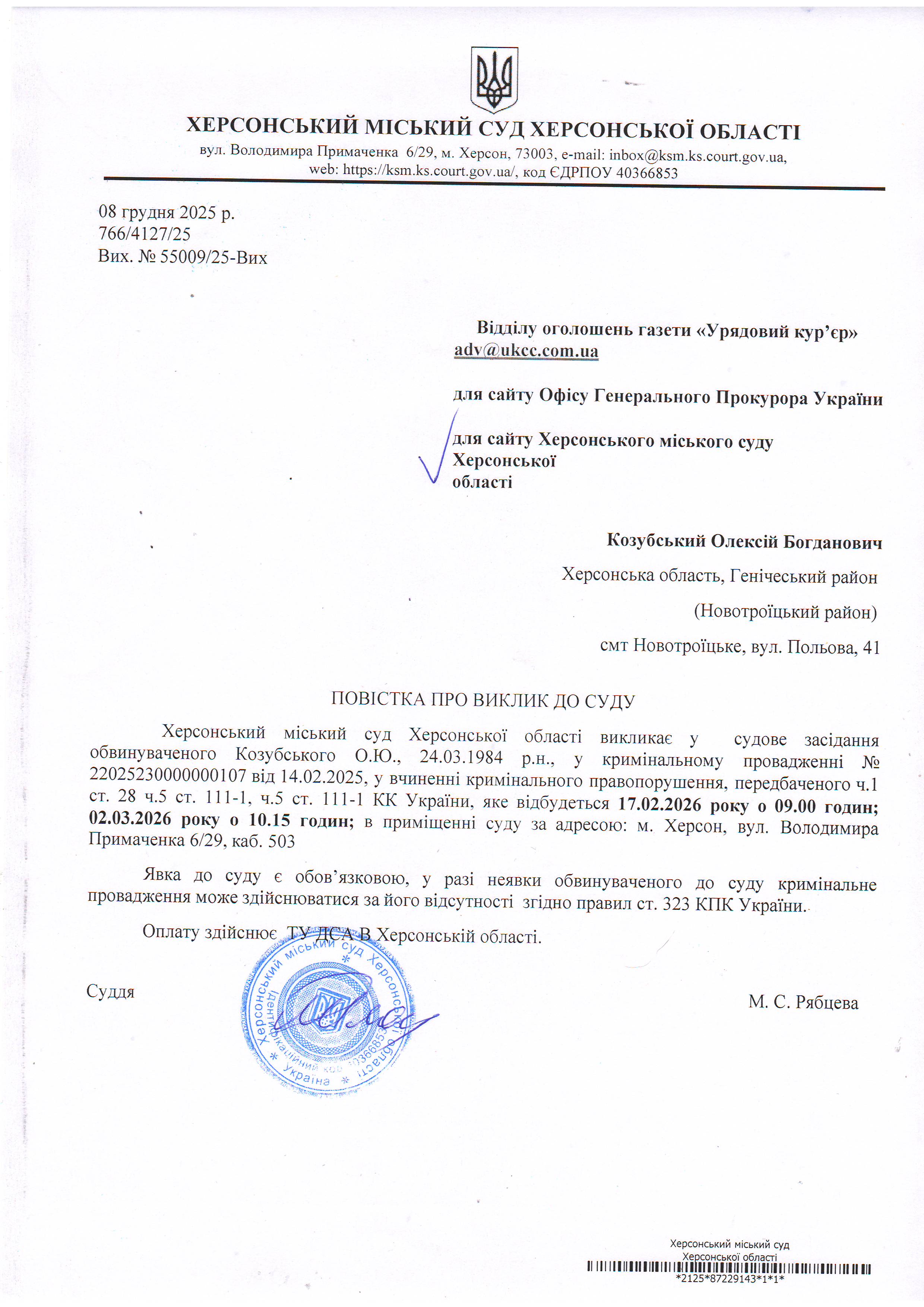 Оголошення про виклик особи в суд та повідомлення про судове рішення
