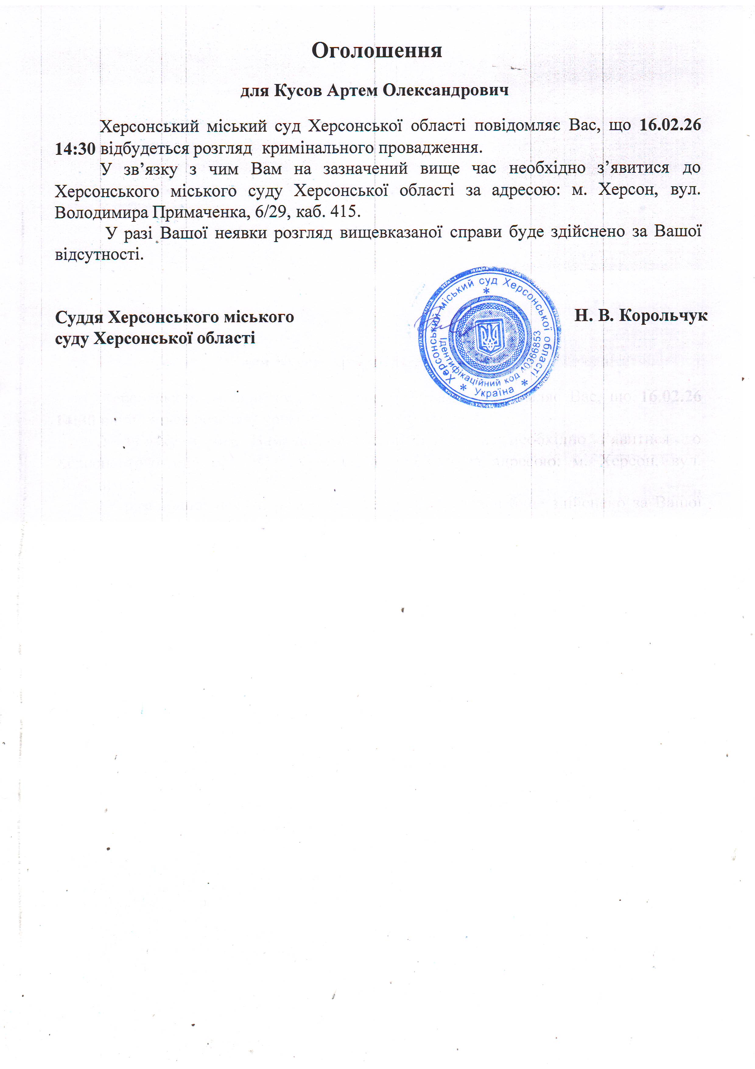 ОГОЛОШЕННЯ ПРО ВИКЛИК ДО СУДУ