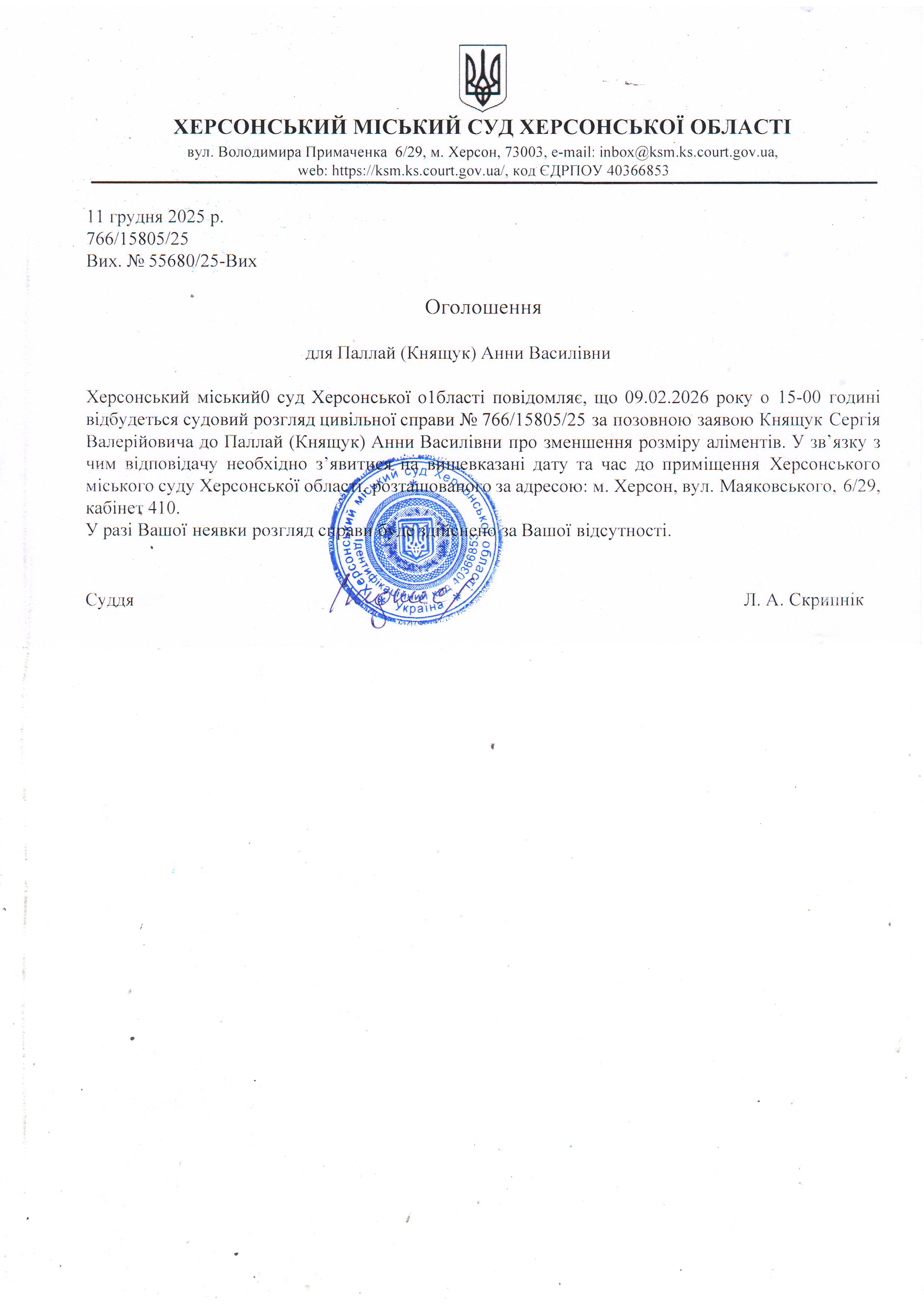 ОГОЛОШЕННЯ ПРО ВИКЛИК ДО СУДУ