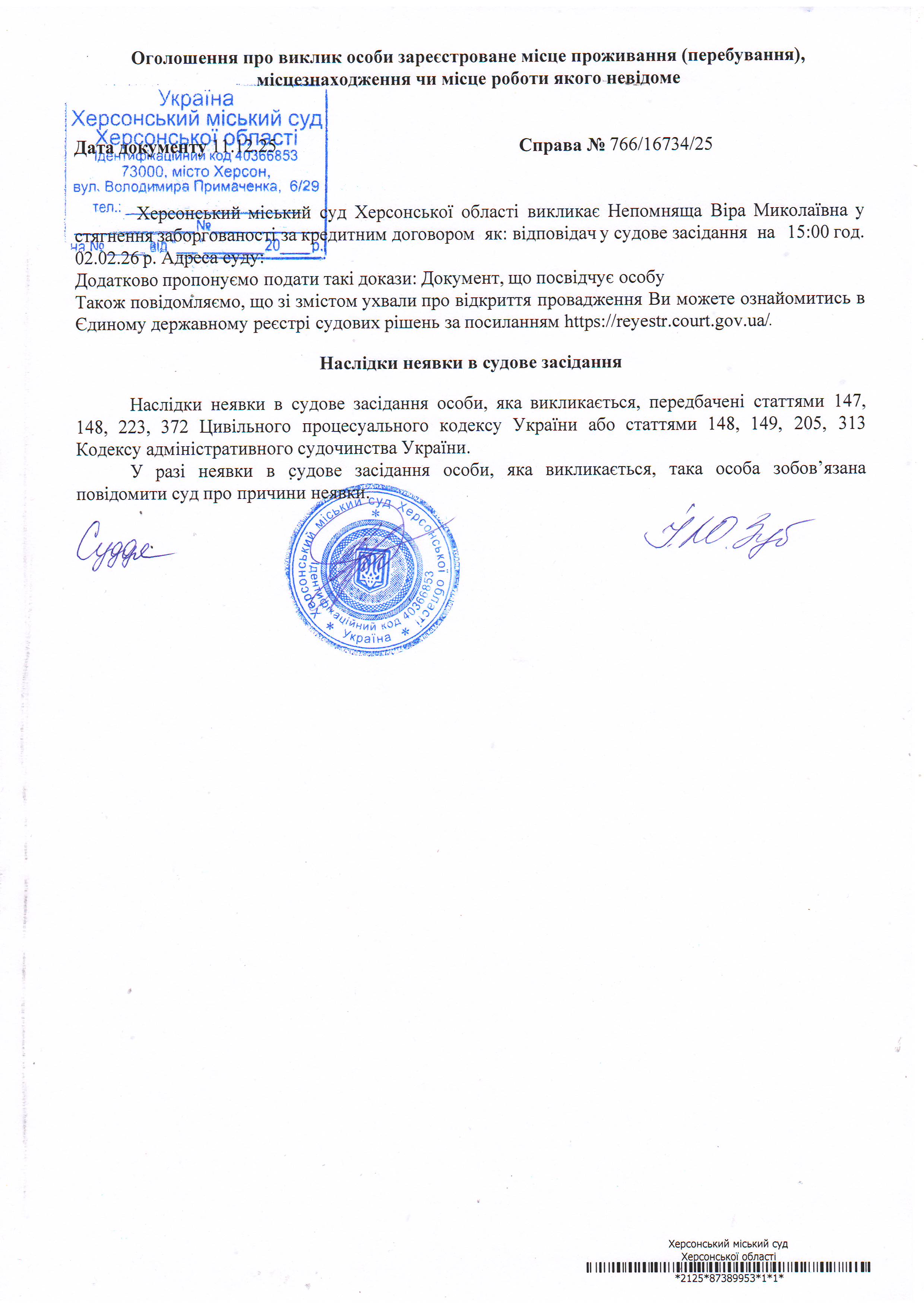 Оголошення про виклик особи в суд та повідомлення про судове рішення