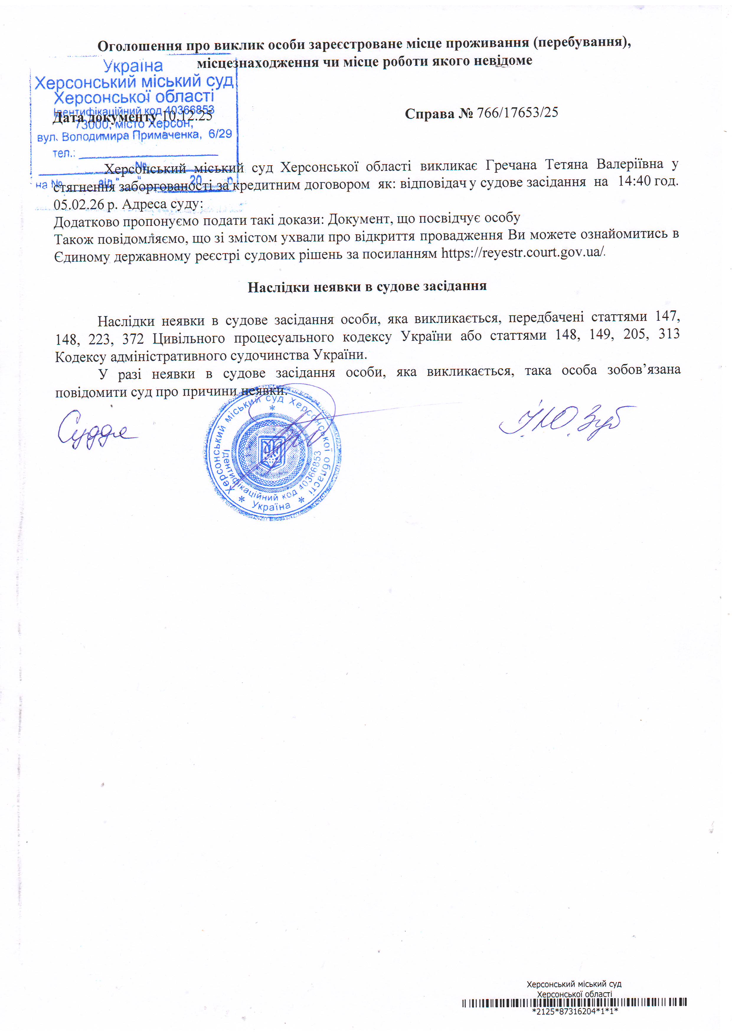 Оголошення про виклик особи в суд та повідомлення про судове рішення