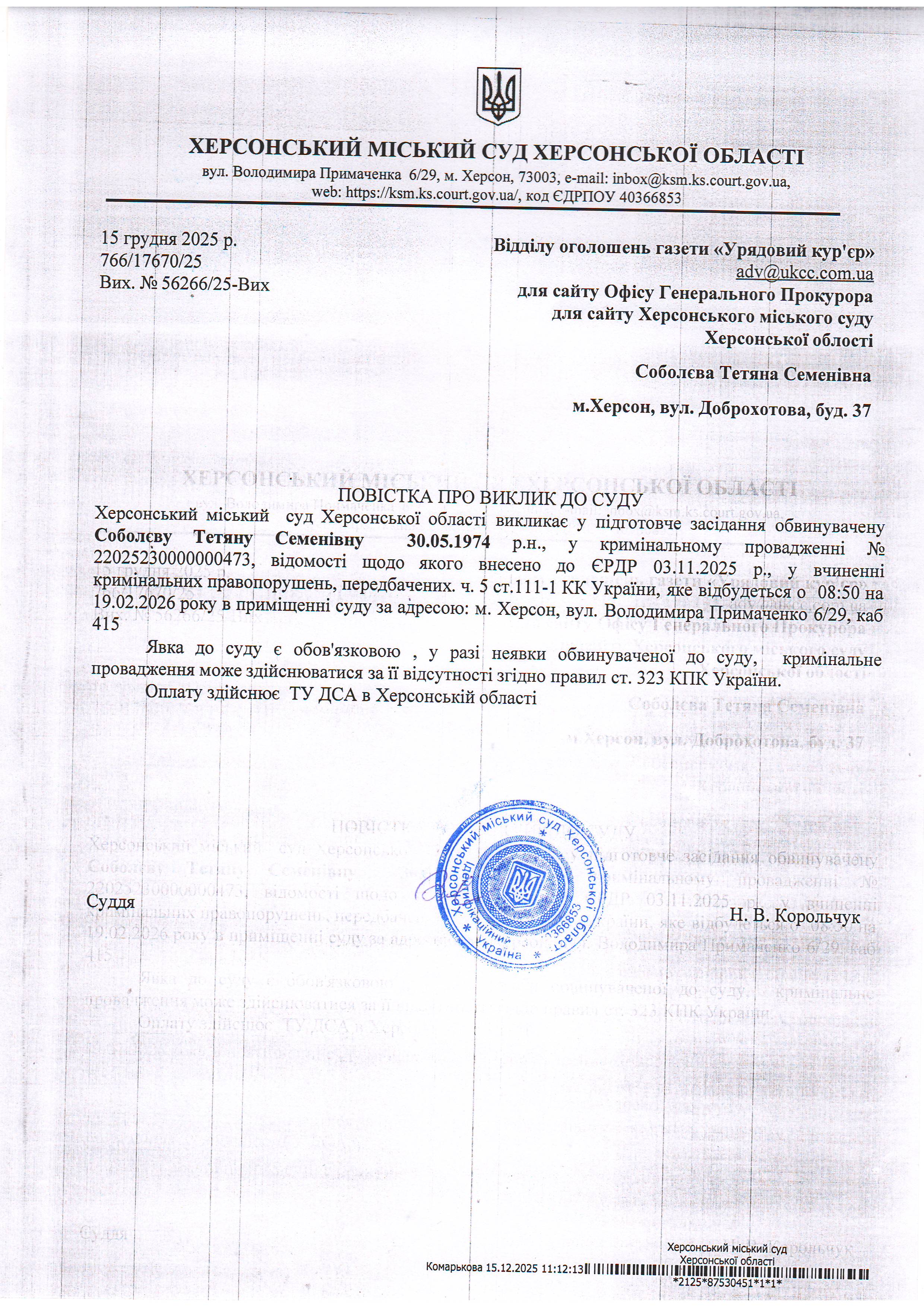 ОГОЛОШЕННЯ ПРО ВИКЛИК ДО СУДУ