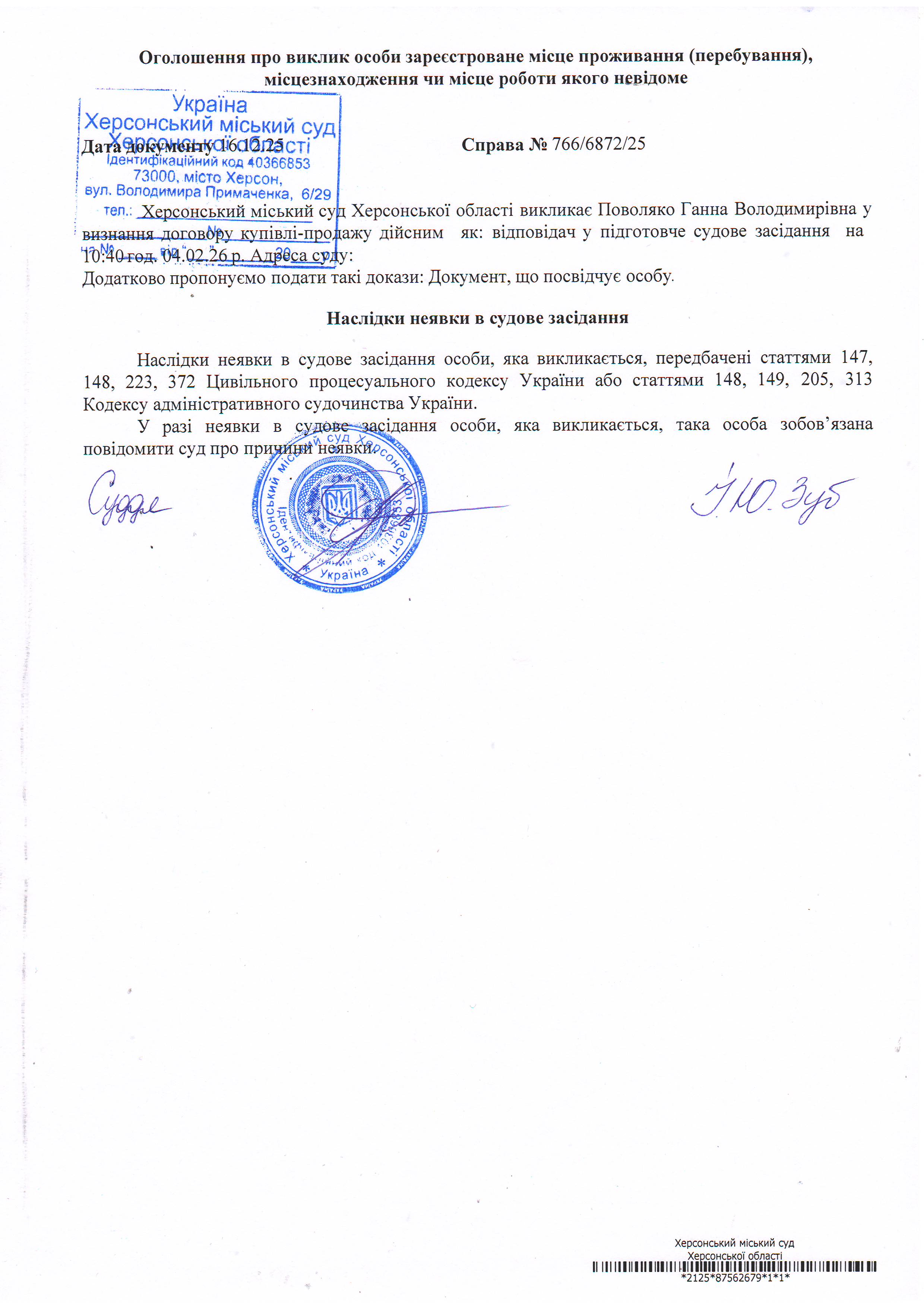 ОГОЛОШЕННЯ ПРО ВИКЛИК ДО СУДУ