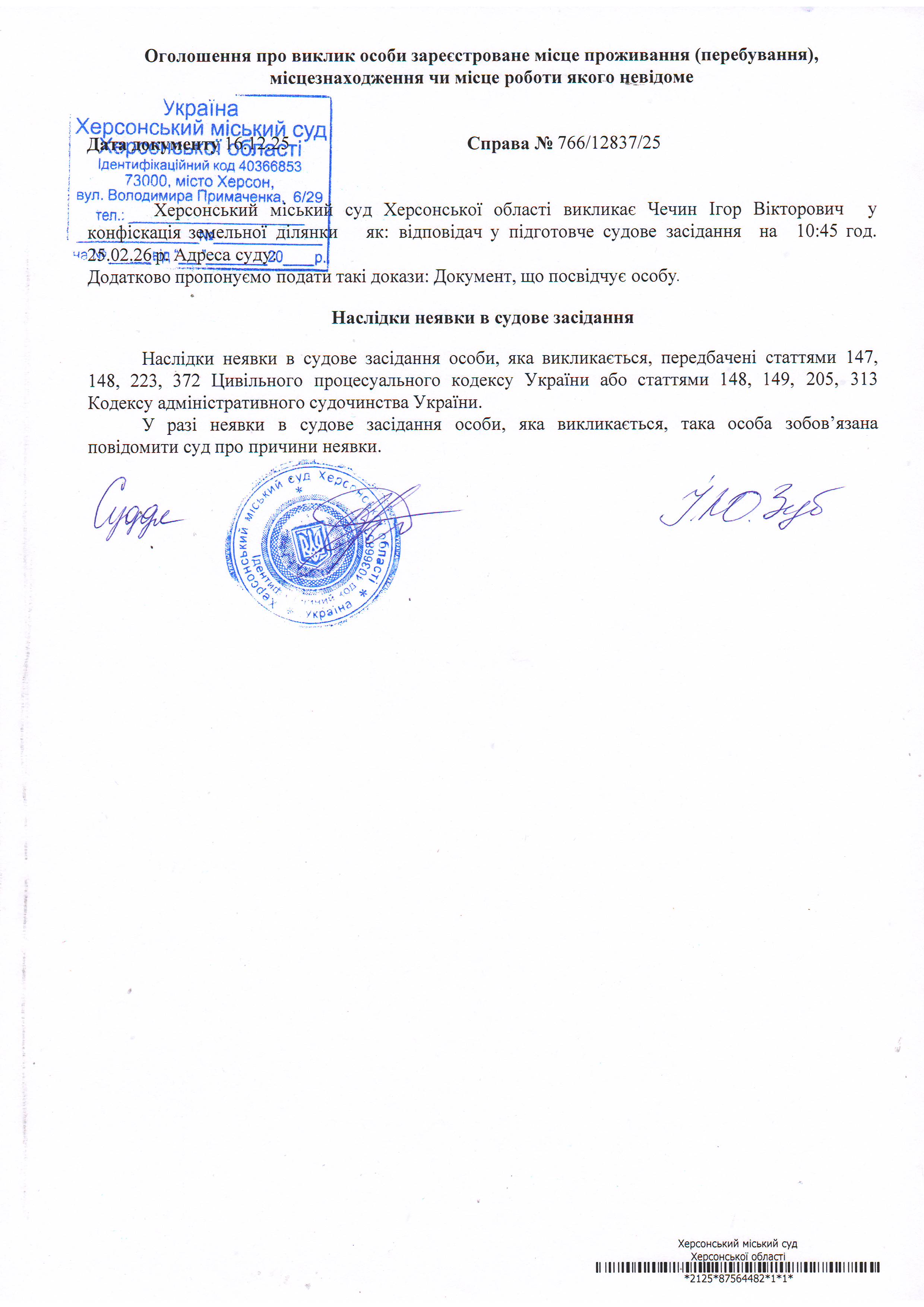 ОГОЛОШЕННЯ ПРО ВИКЛИК ДО СУДУ