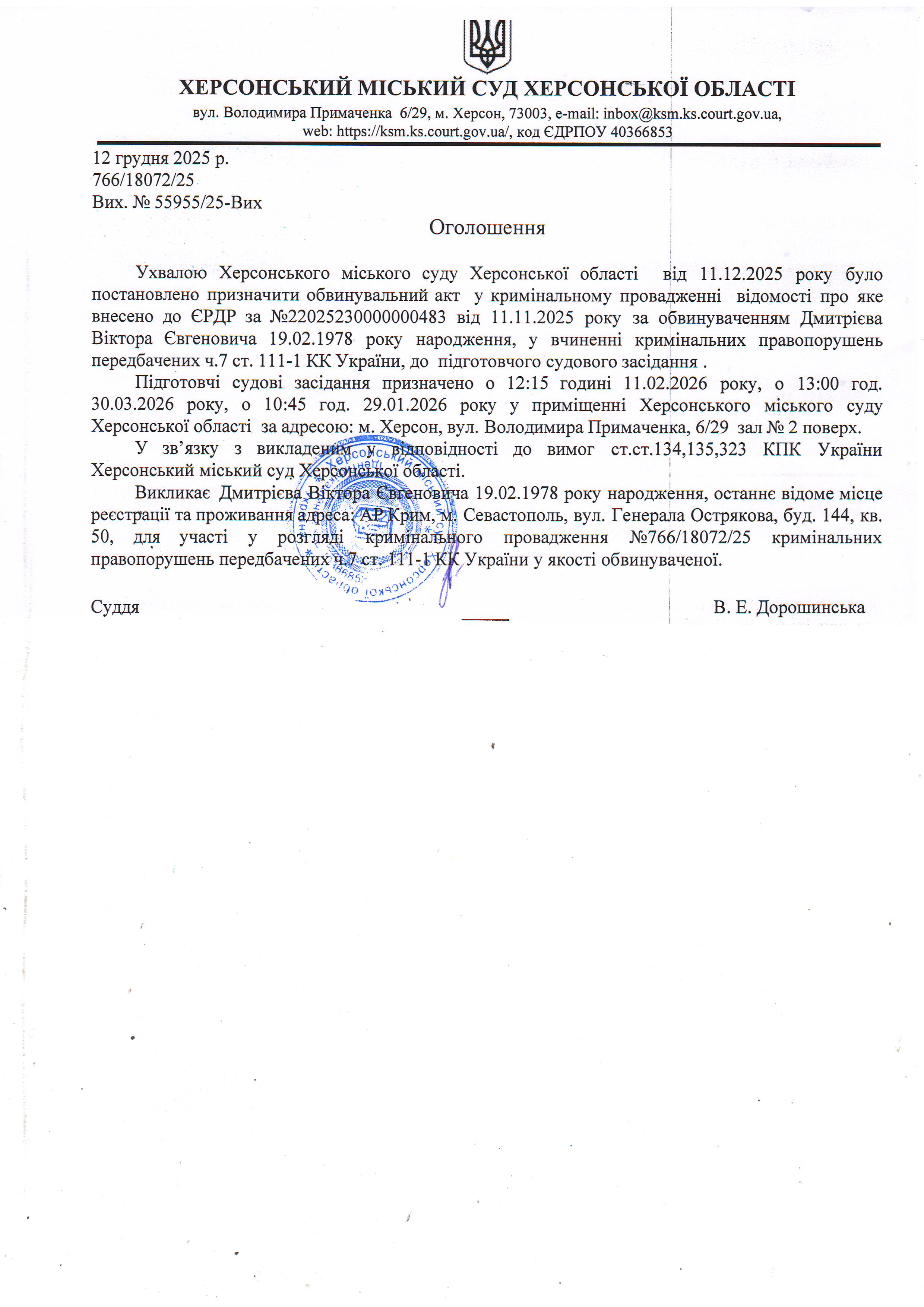 ОГОЛОШЕННЯ ПРО ВИКЛИК ДО СУДУ