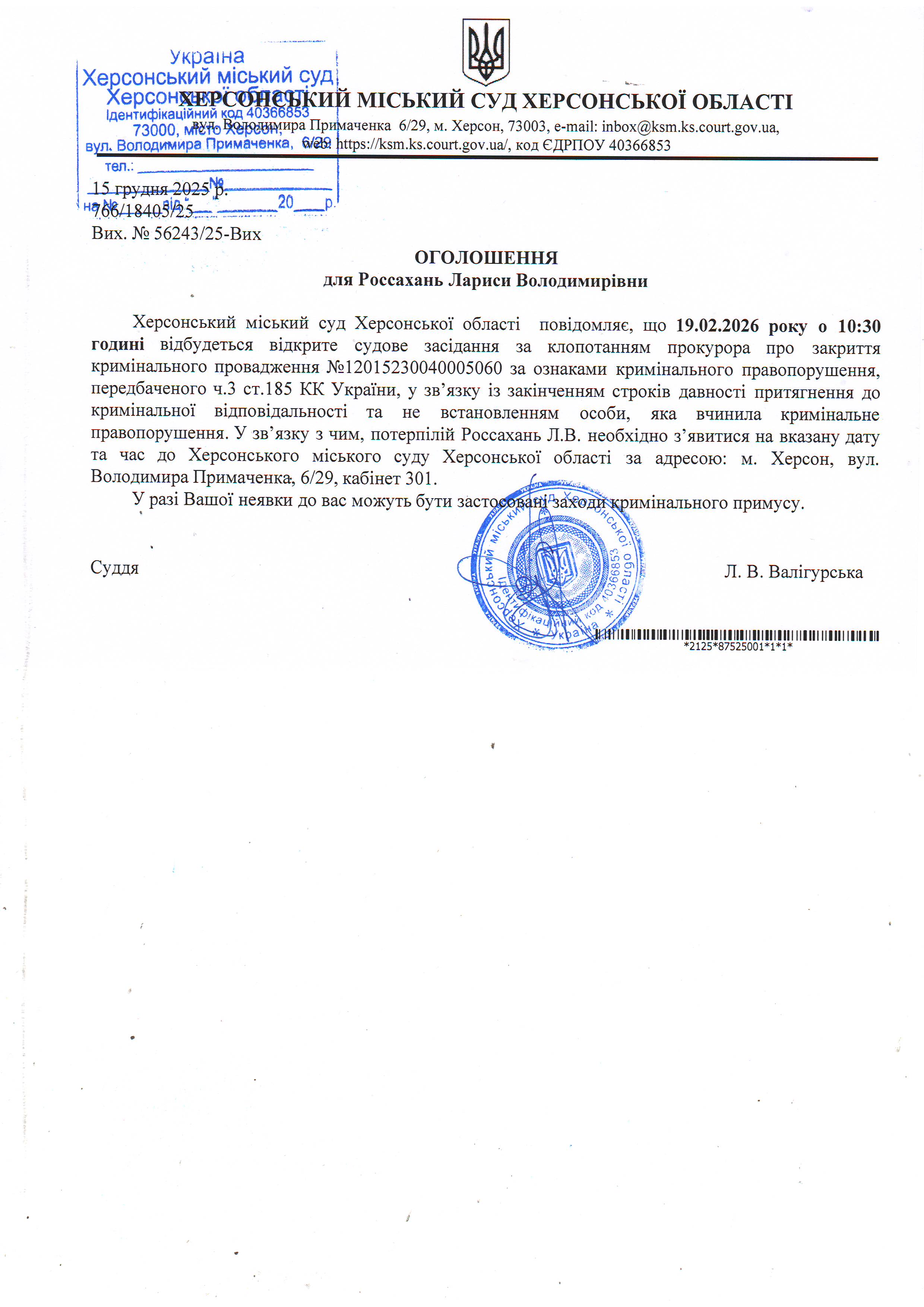 Оголошення для Россахань Лариси Володимирівни