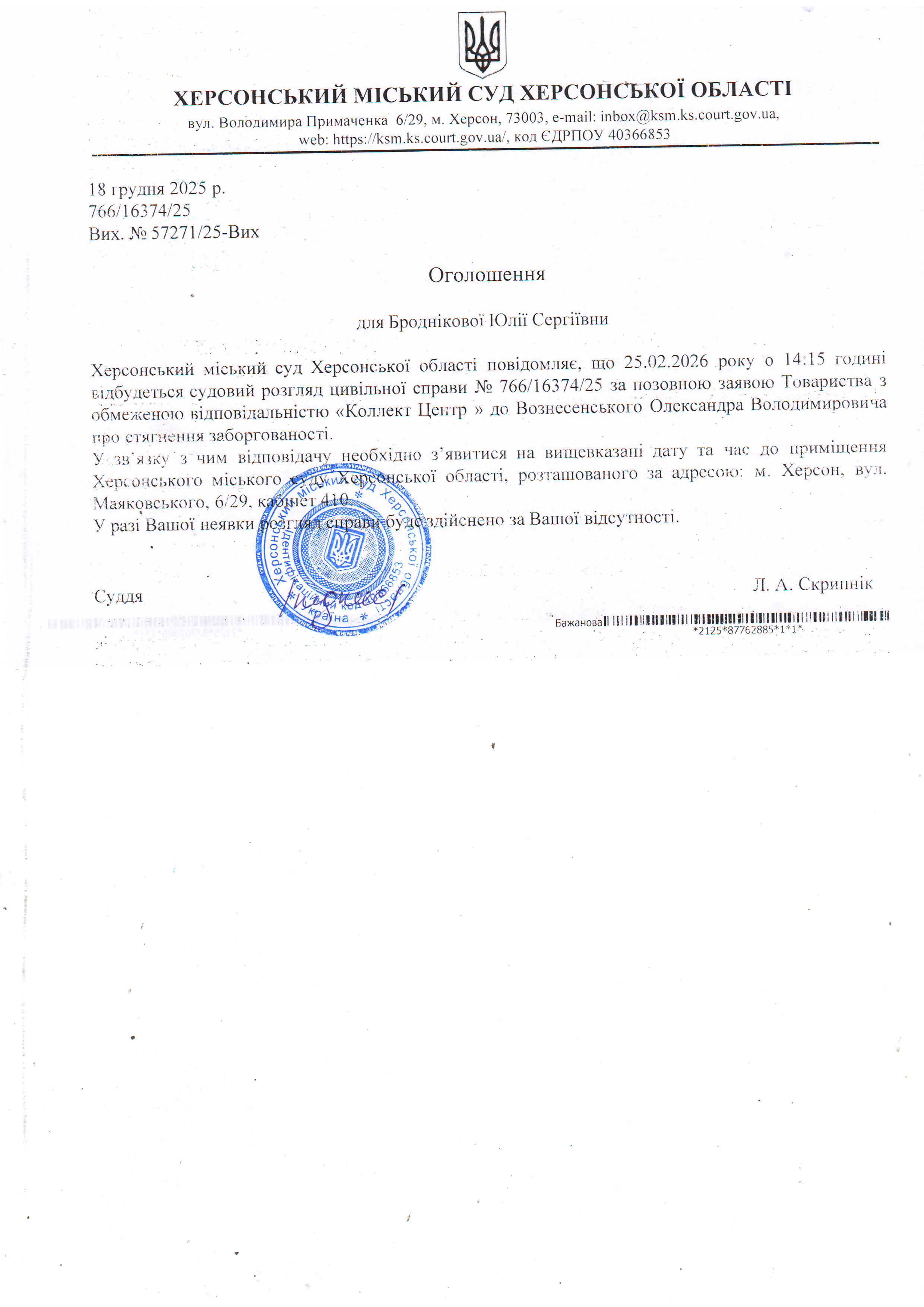 ОГОЛОШЕННЯ ПРО ВИКЛИК ДО СУДУ