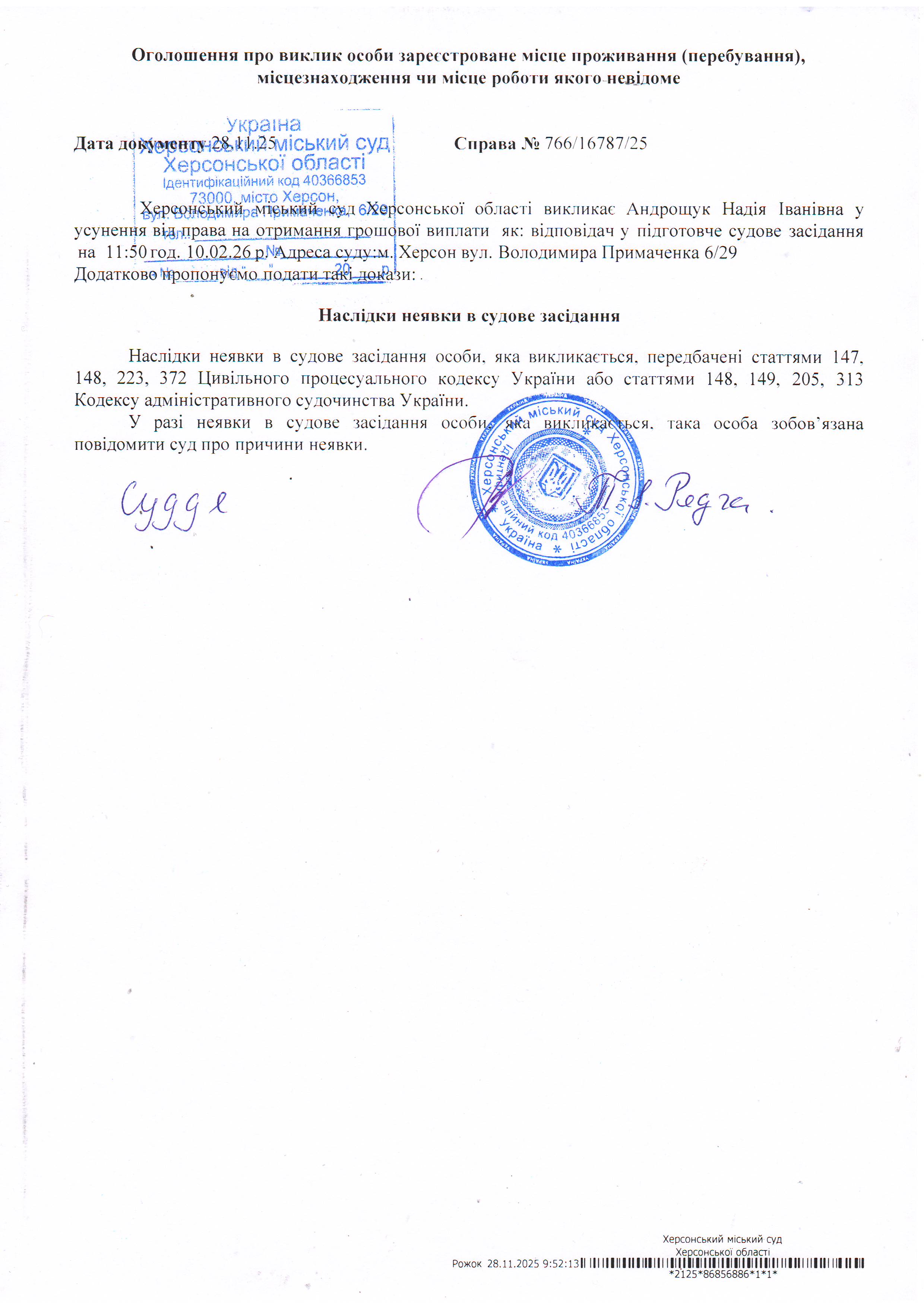 ОГОЛОШЕННЯ ПРО ВИКЛИК ДО СУДУ