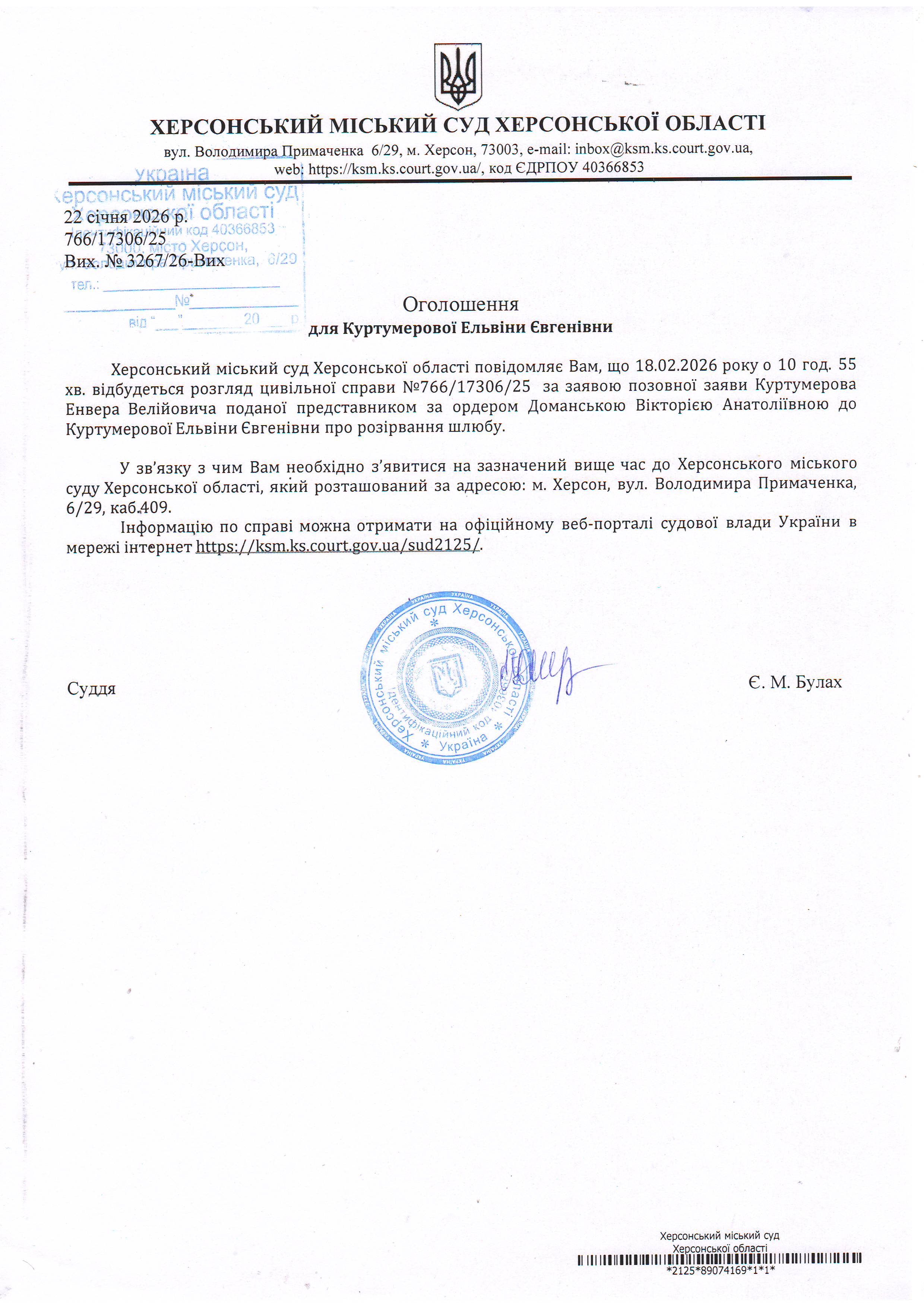 Оголошення для Куртумерової Ельвіни Євгенівни