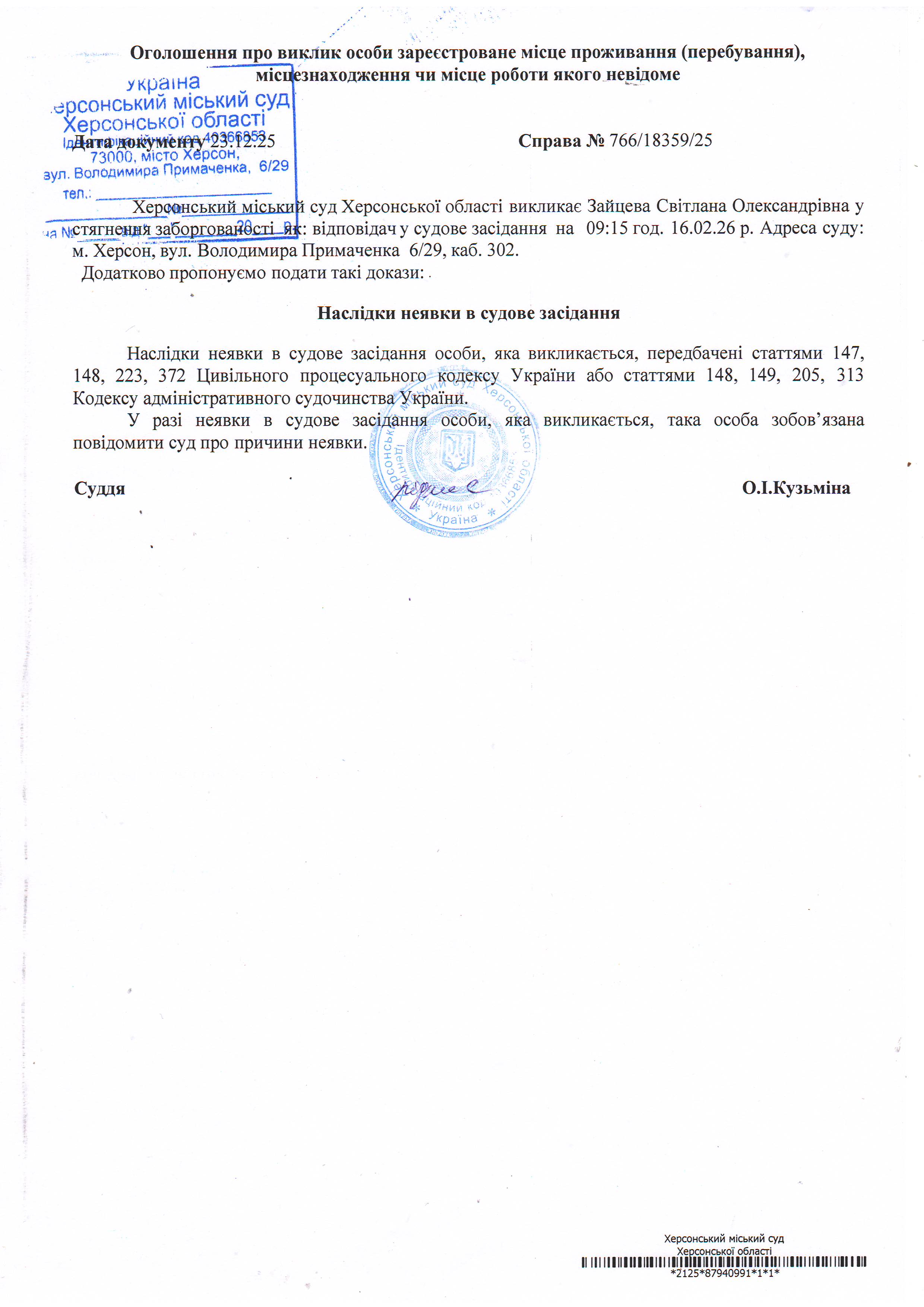 ОГОЛОШЕННЯ ПРО ВИКЛИК ДО СУДУ