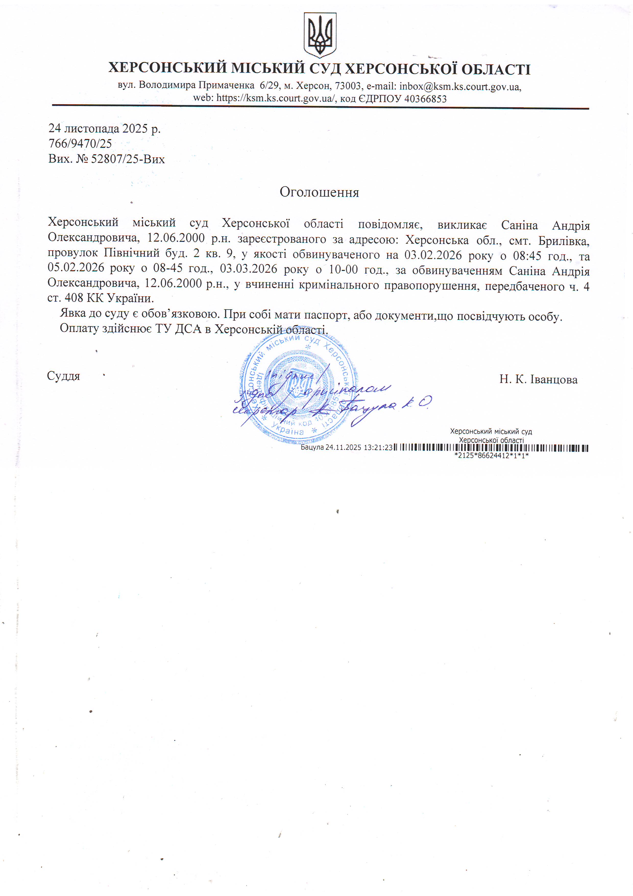 Оголошення про виклик особи в суд та повідомлення про судове рішення
