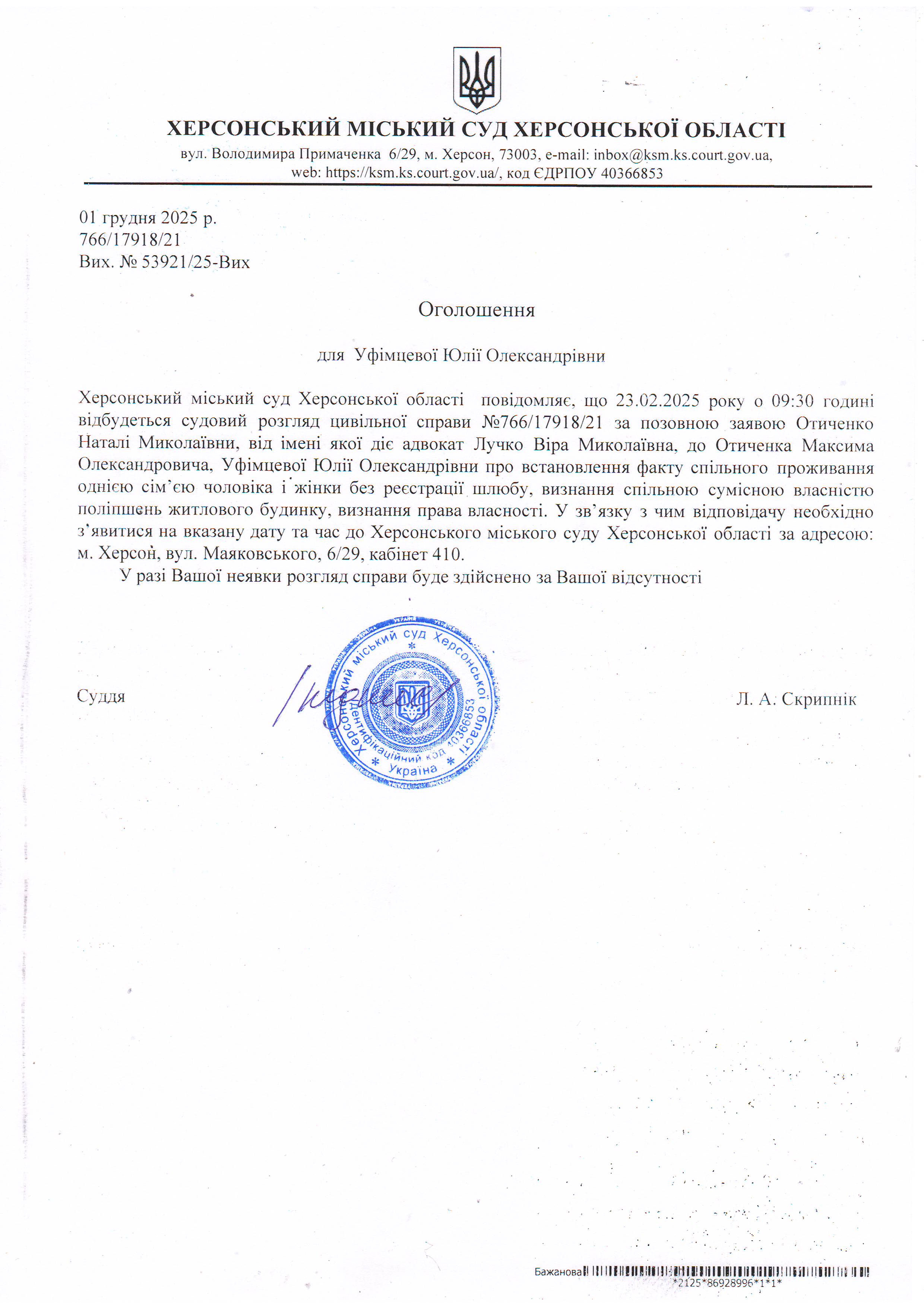 ОГОЛОШЕННЯ ПРО ВИКЛИК ДО СУДУ