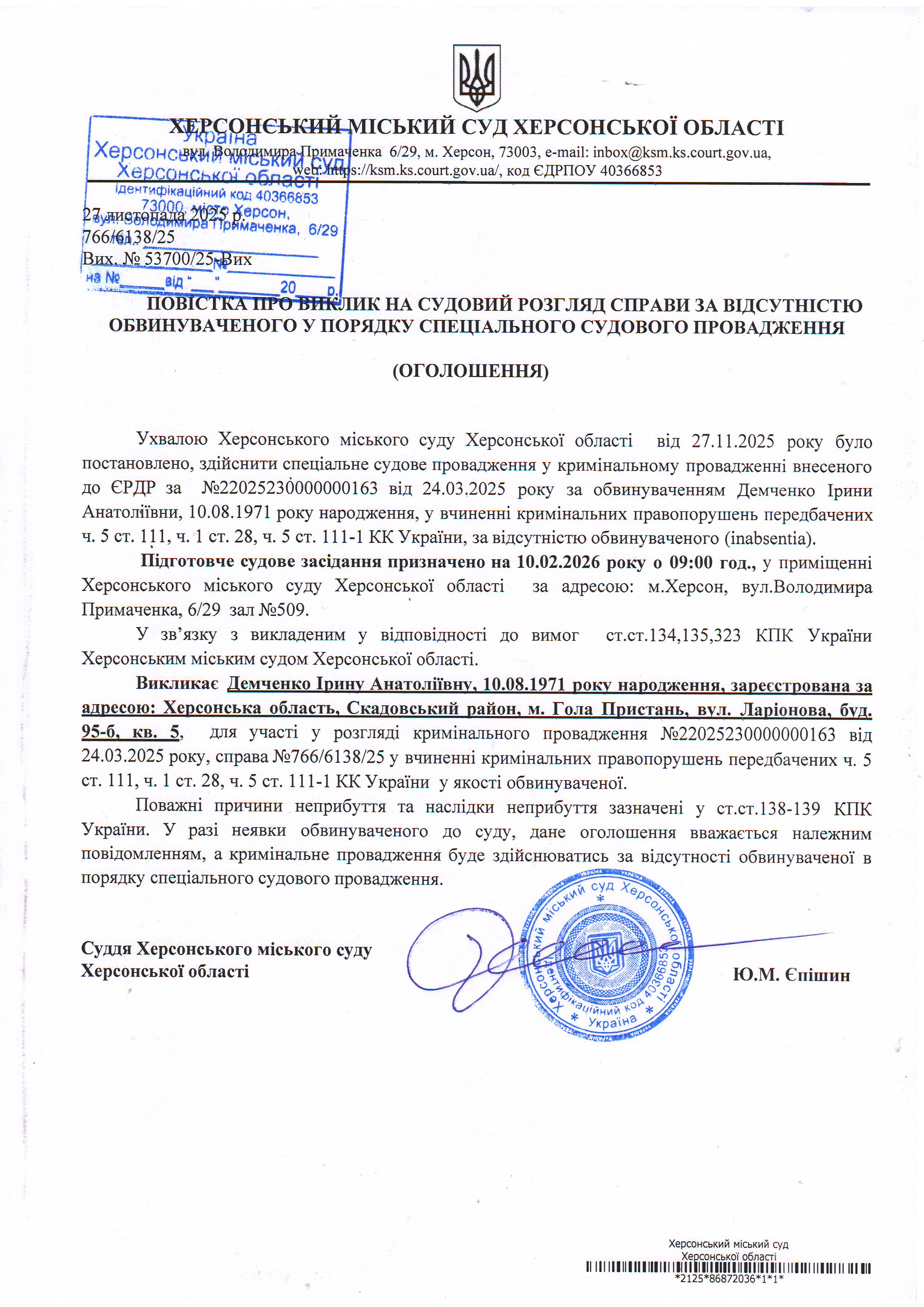 ОГОЛОШЕННЯ ПРО ВИКЛИК ДО СУДУ