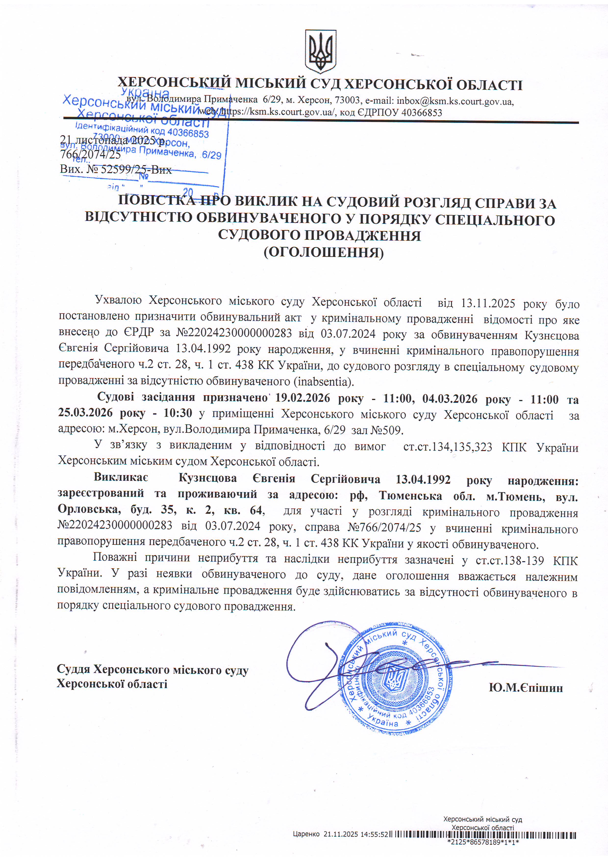 Оголошення для Кузнєцова Євгенія Сергійовича