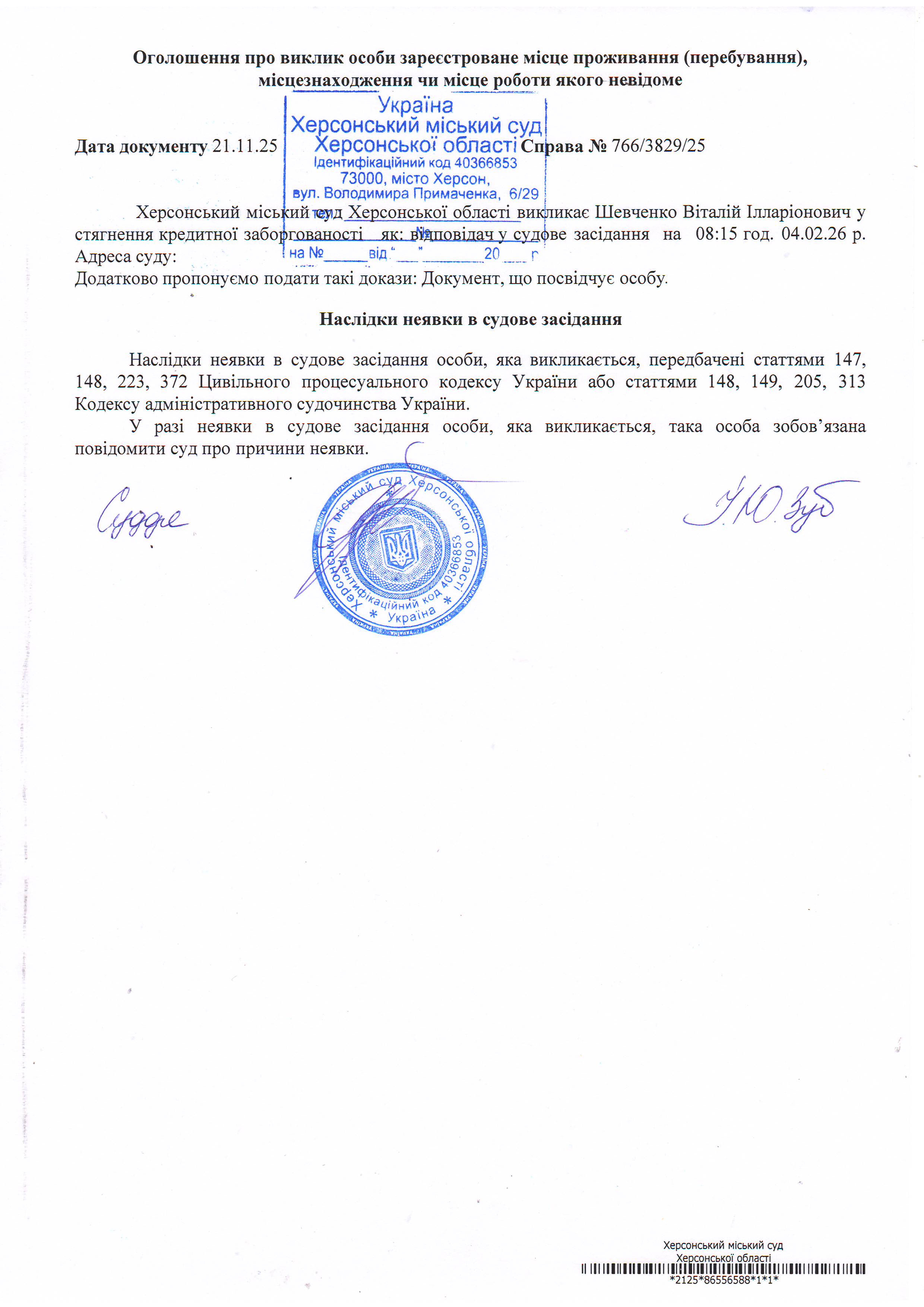ОГОЛОШЕННЯ ПРО ВИКЛИК ДО СУДУ