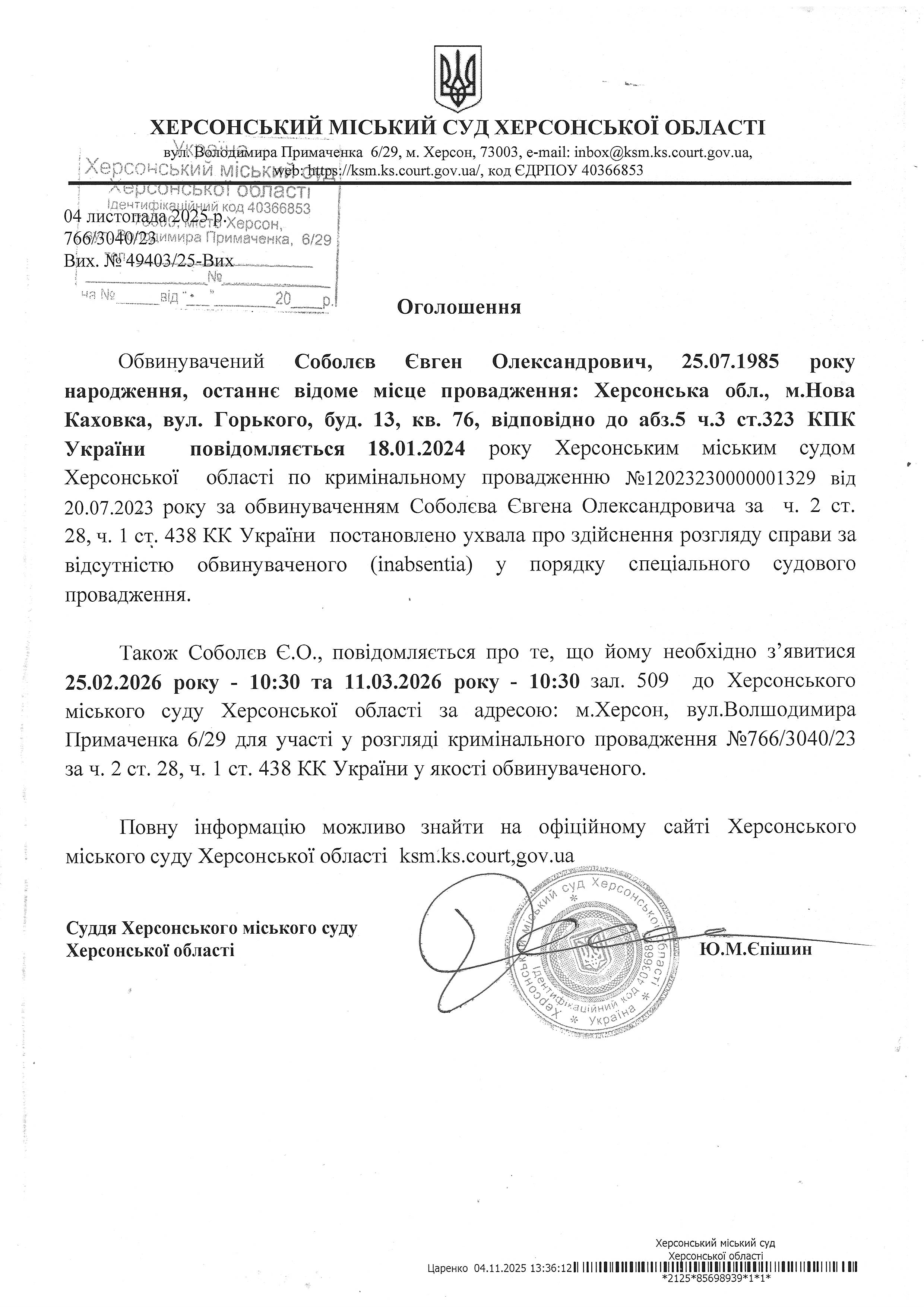 ОГОЛОШЕННЯ ПРО ВИКЛИК ДО СУДУ