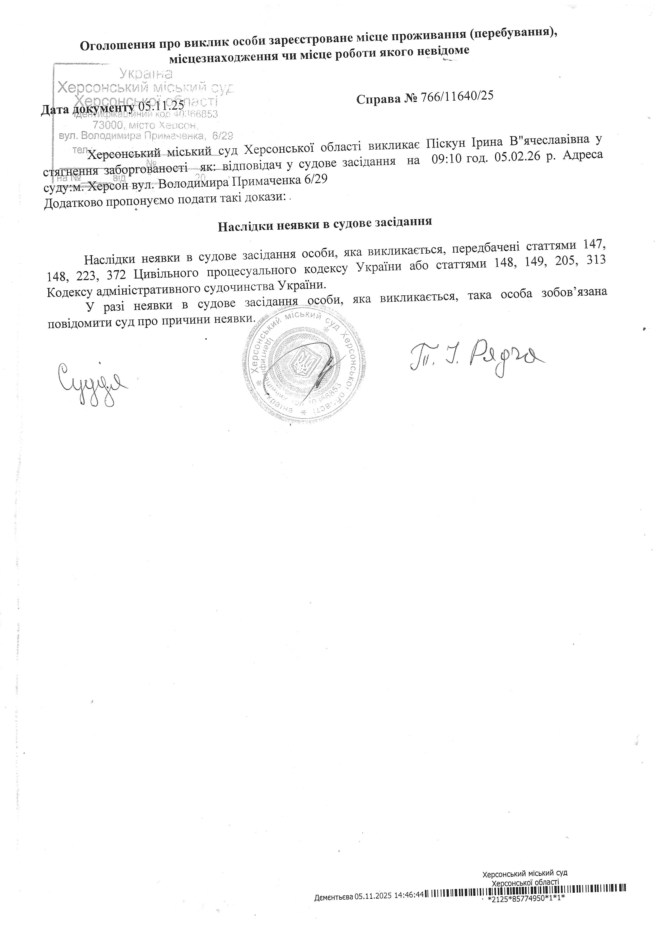 ОГОЛОШЕННЯ ПРО ВИКЛИК ДО СУДУ