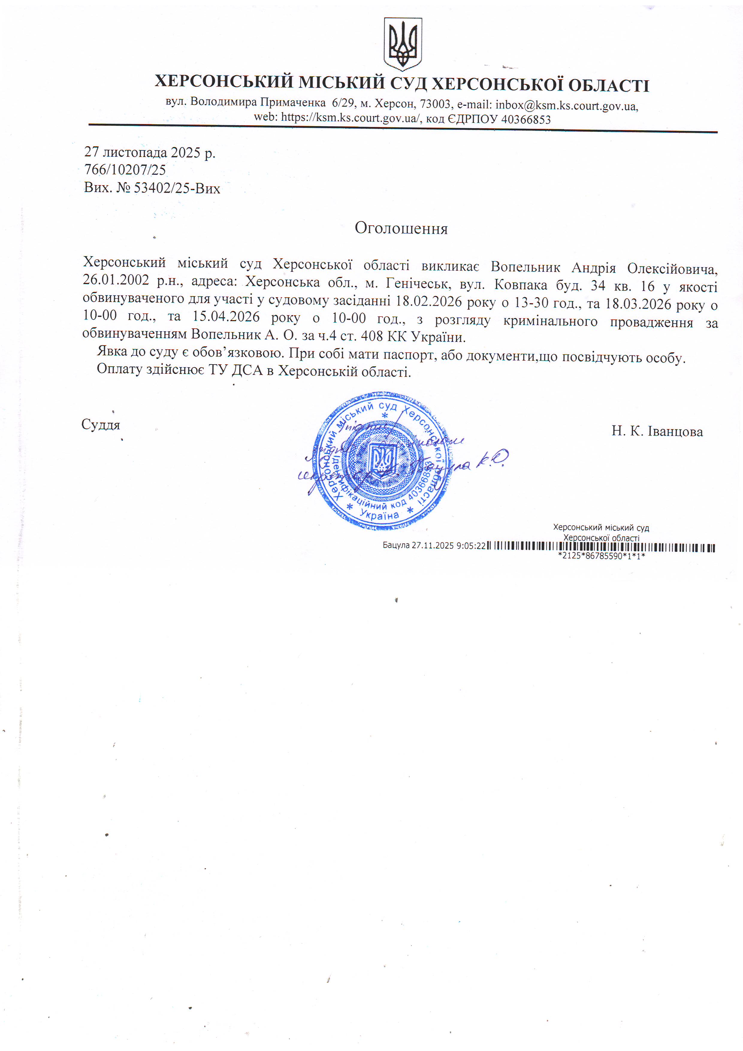 ОГОЛОШЕННЯ ПРО ВИКЛИК ДО СУДУ
