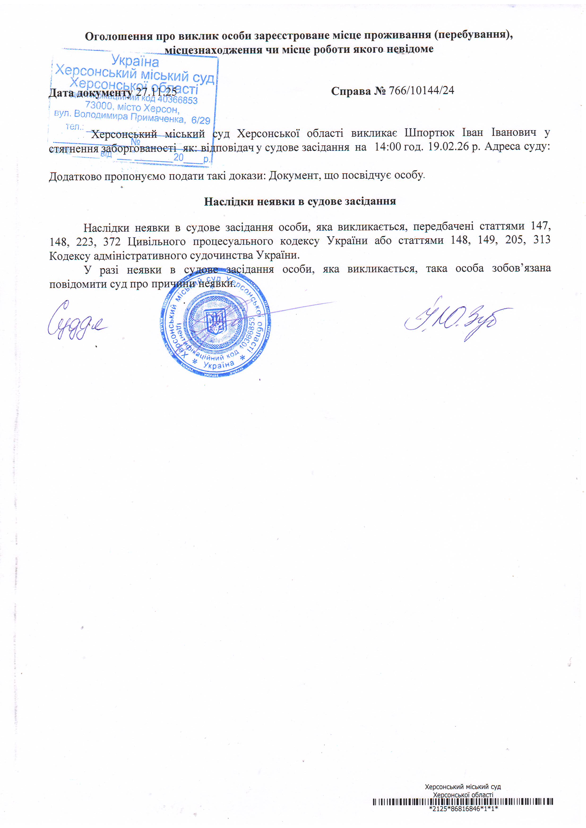 ОГОЛОШЕННЯ ПРО ВИКЛИК ДО СУДУ