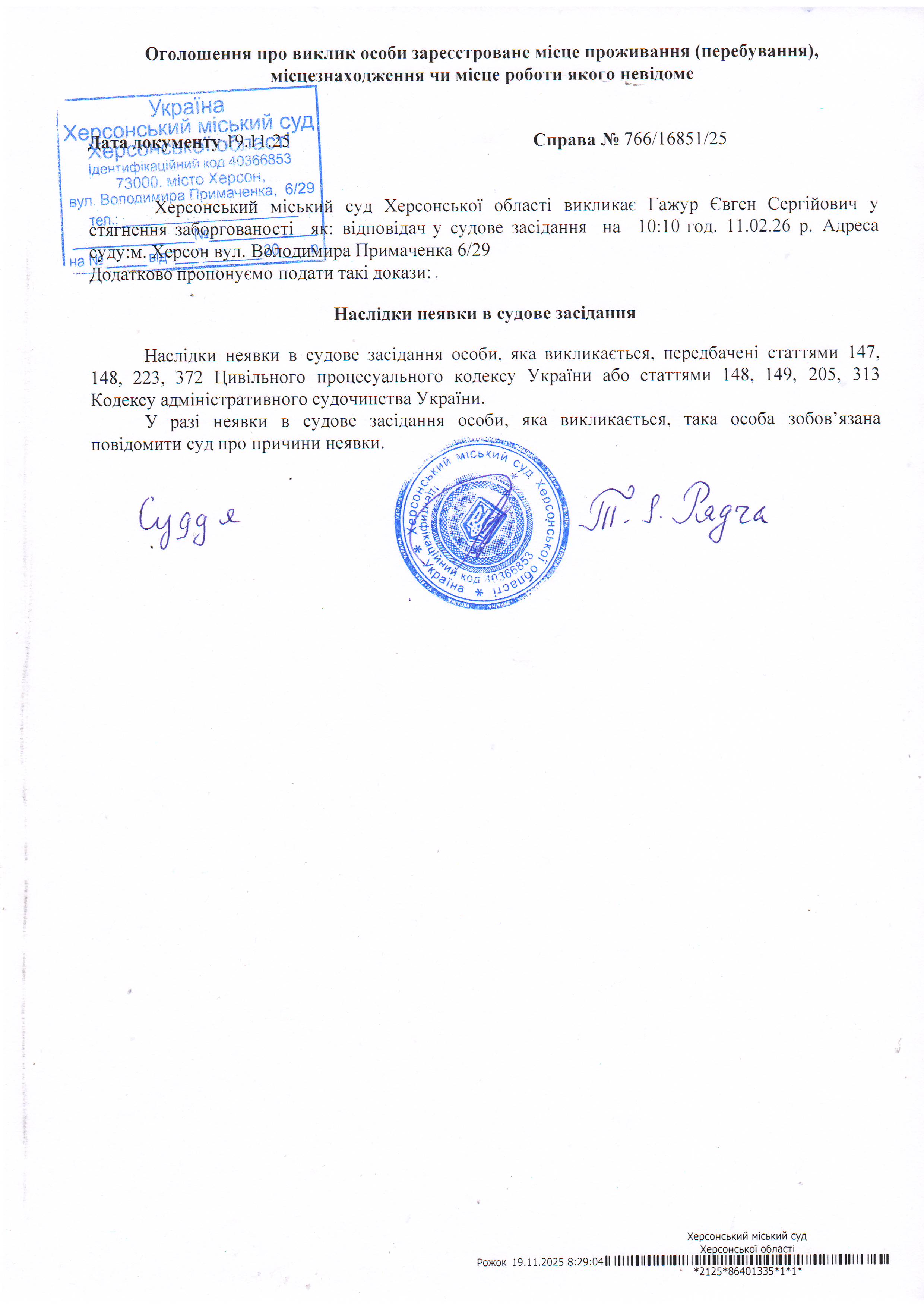 ОГОЛОШЕННЯ ПРО ВИКЛИК ДО СУДУ