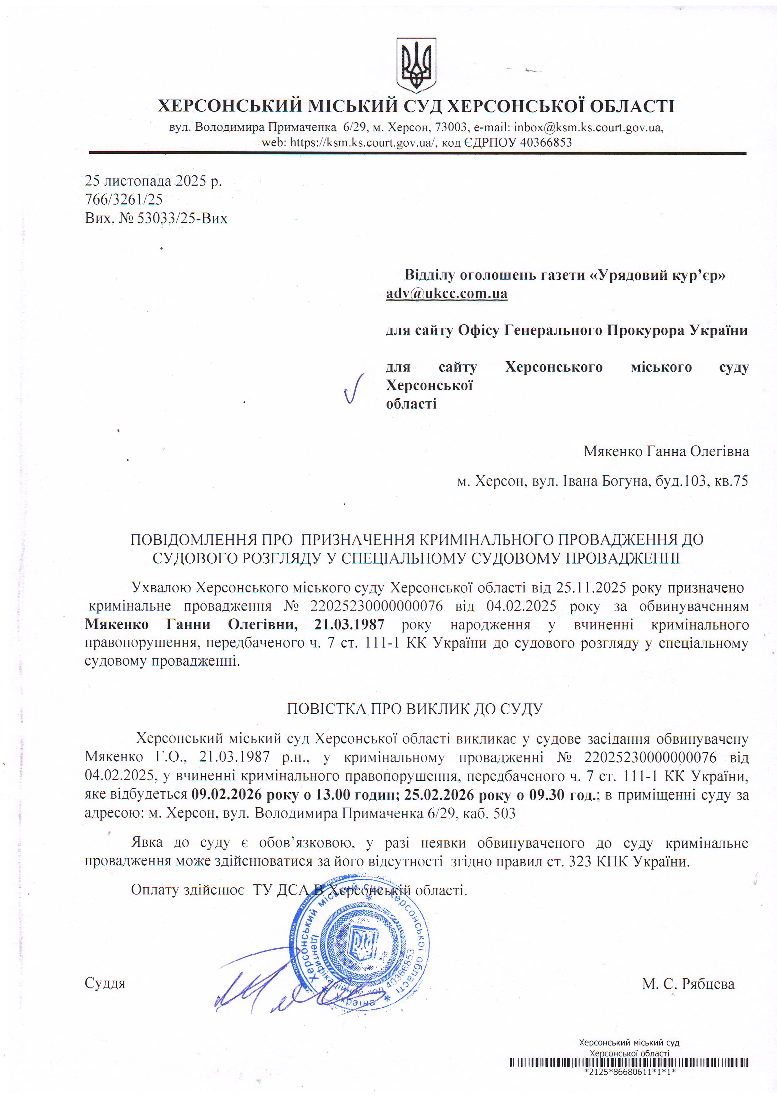 Оголошення про виклик особи в суд та повідомлення про судове рішення