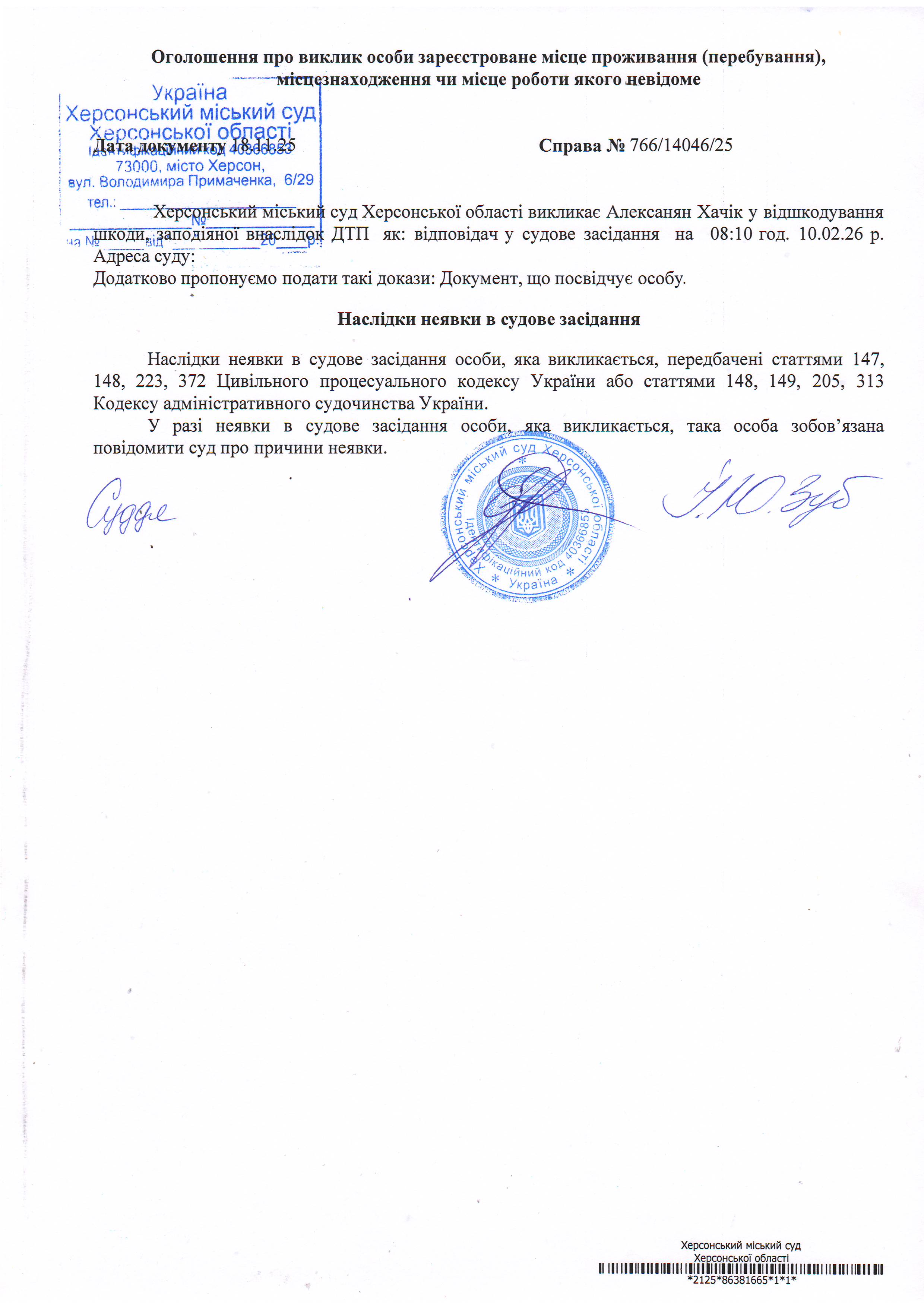 ОГОЛОШЕННЯ ПРО ВИКЛИК ДО СУДУ