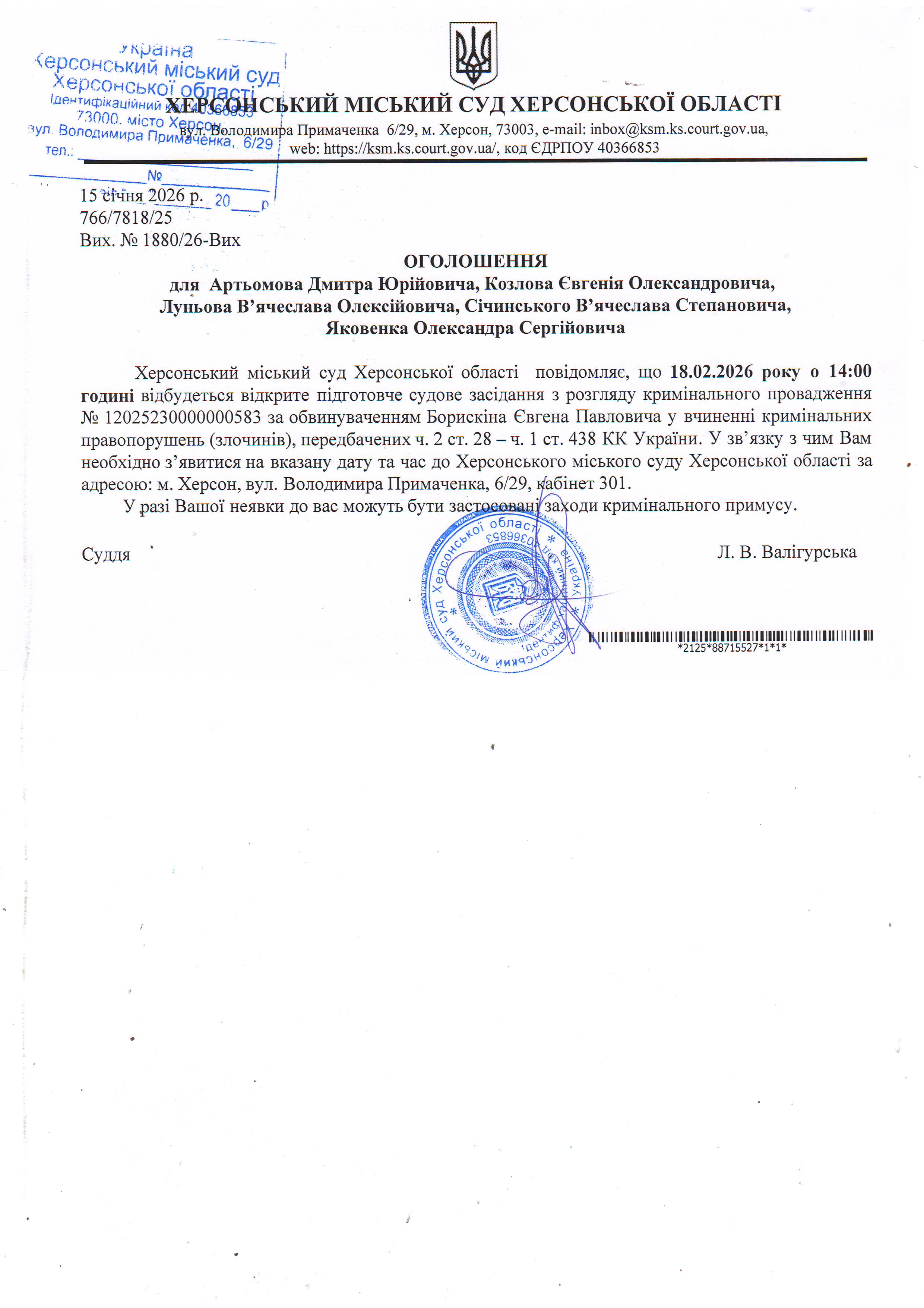 Оголошення для Артьомова Д.Ю., Козлова Є.О., Луньова В.О., Січинського В.С., Яковенка О.С.