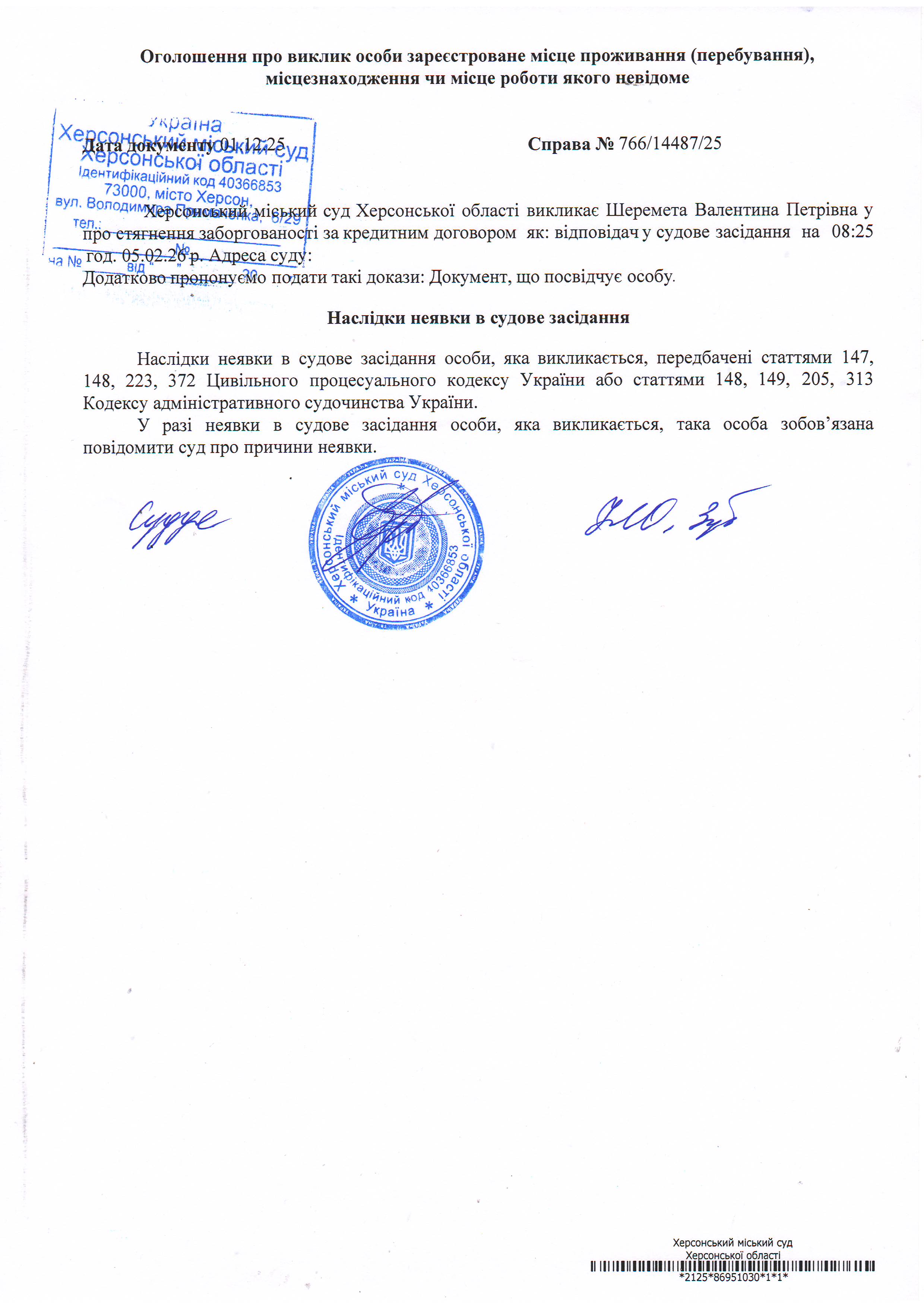ОГОЛОШЕННЯ ПРО ВИКЛИК ДО СУДУ