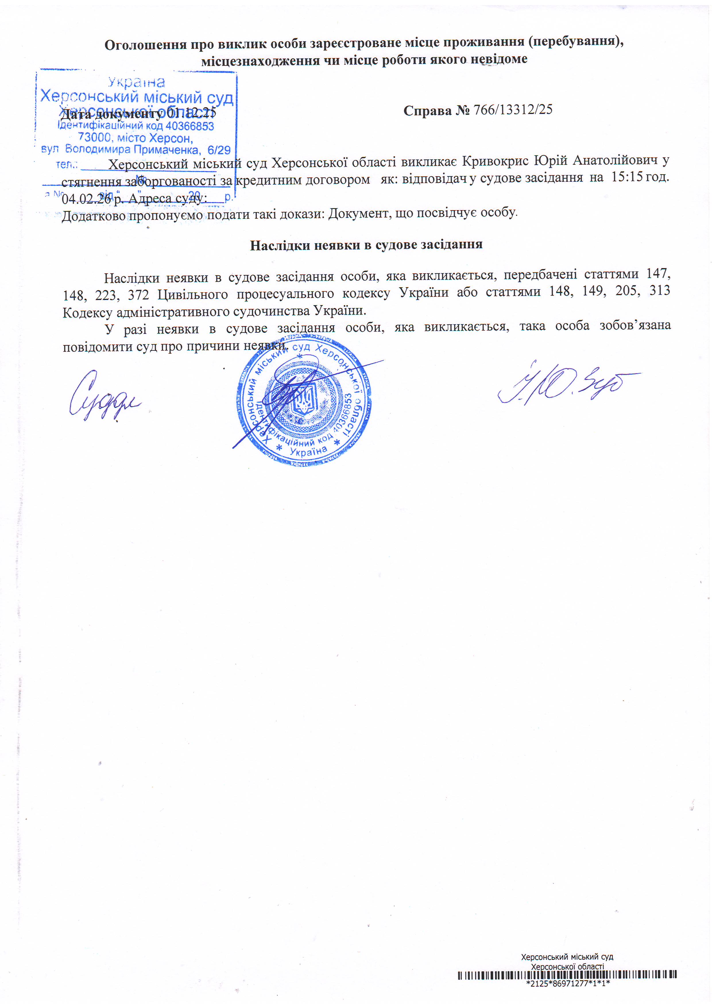 ОГОЛОШЕННЯ ПРО ВИКЛИК ДО СУДУ