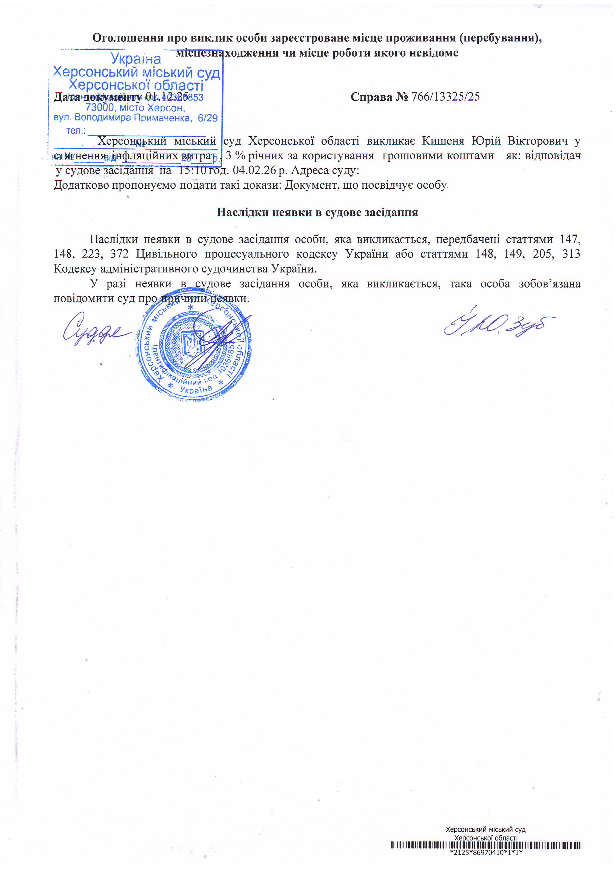 ОГОЛОШЕННЯ ПРО ВИКЛИК ДО СУДУ