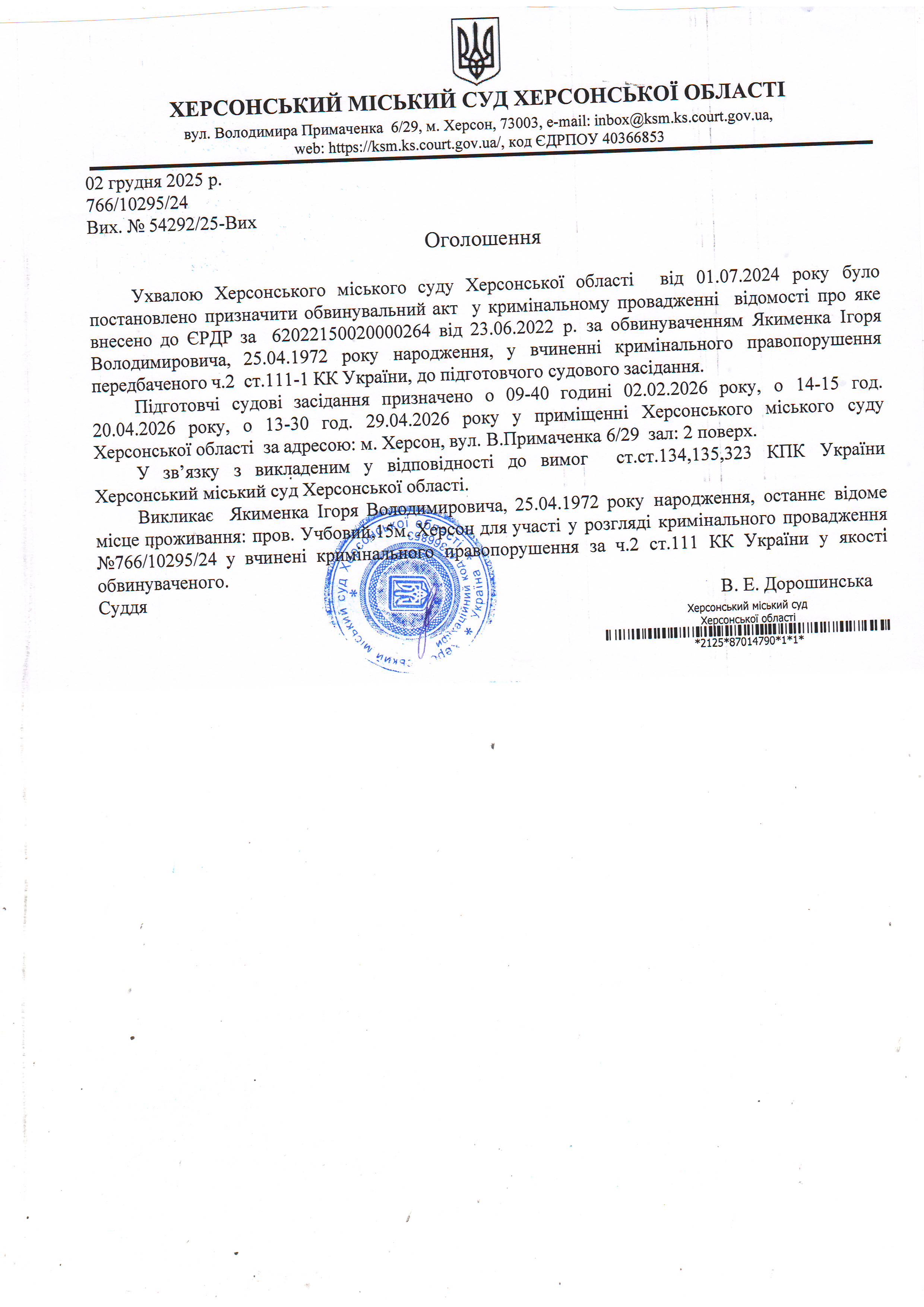 ОГОЛОШЕННЯ ПРО ВИКЛИК ДО СУДУ