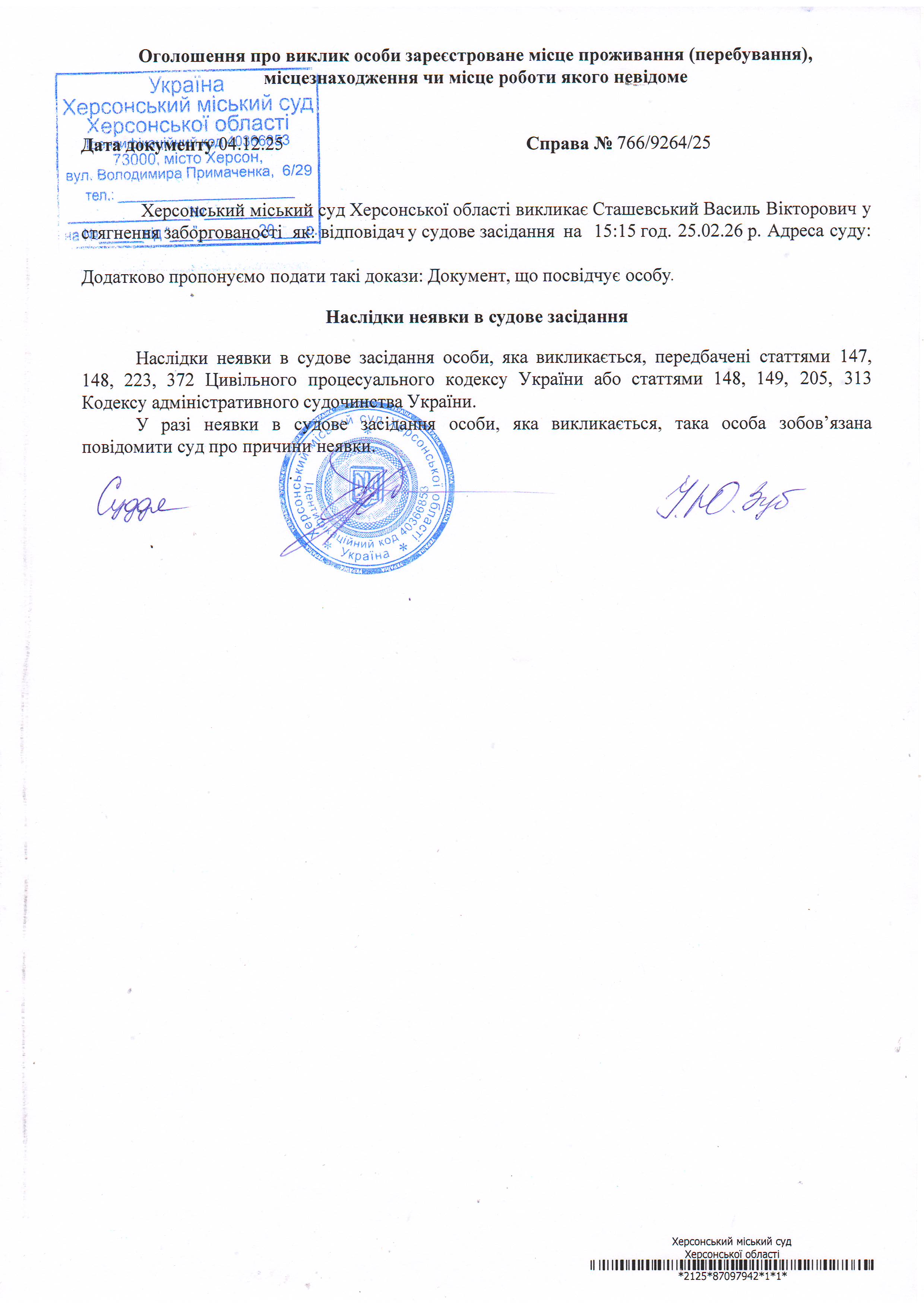 ОГОЛОШЕННЯ ПРО ВИКЛИК ДО СУДУ