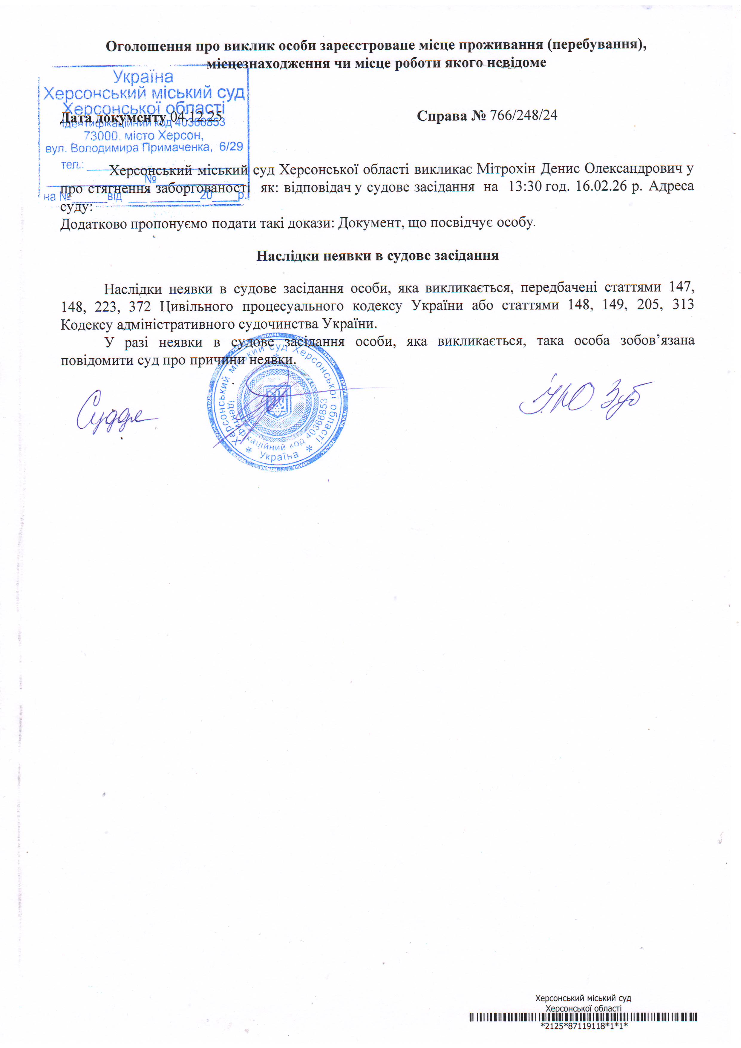 ОГОЛОШЕННЯ ПРО ВИКЛИК ДО СУДУ