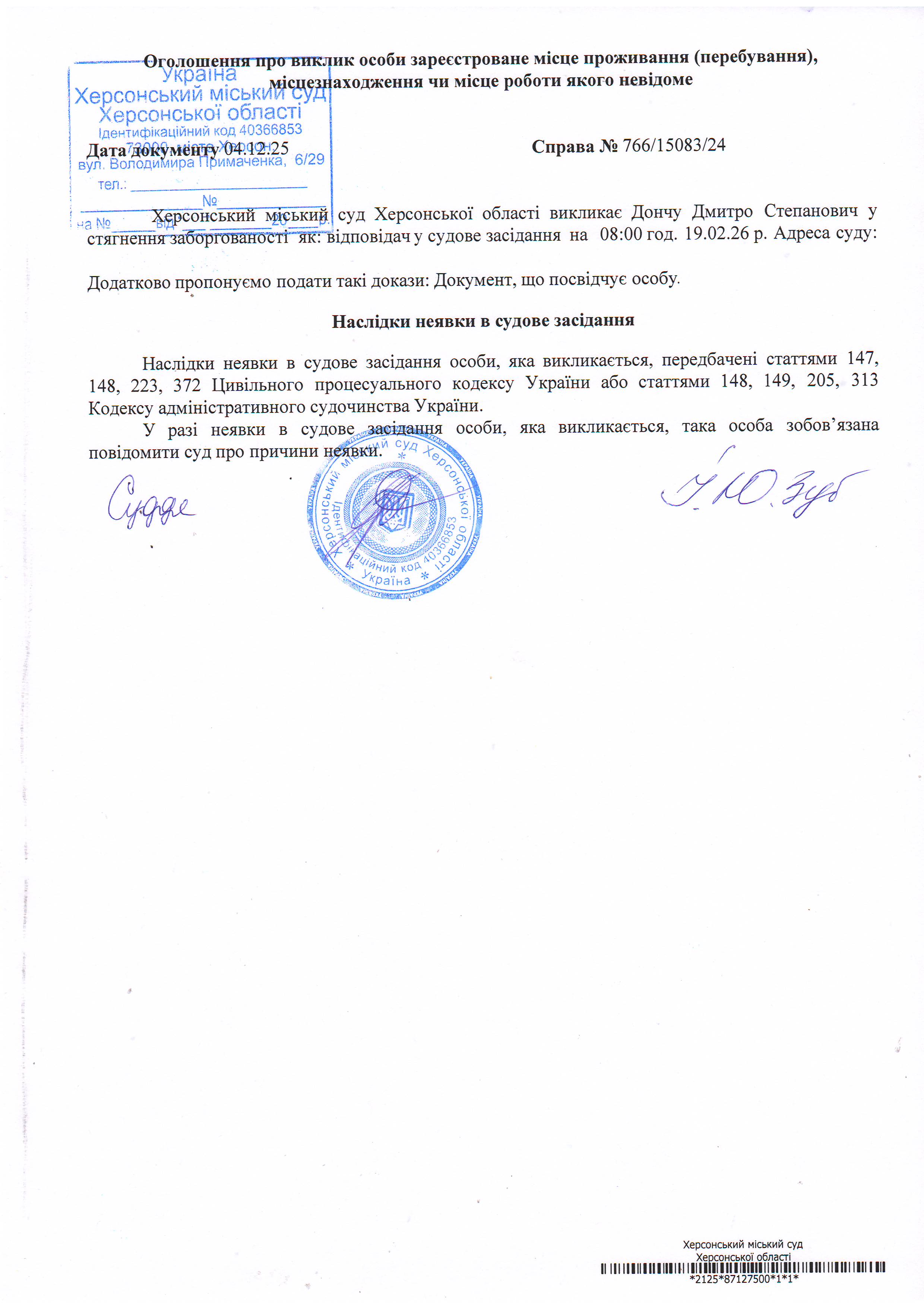 Оголошення про виклик особи в суд та повідомлення про судове рішення