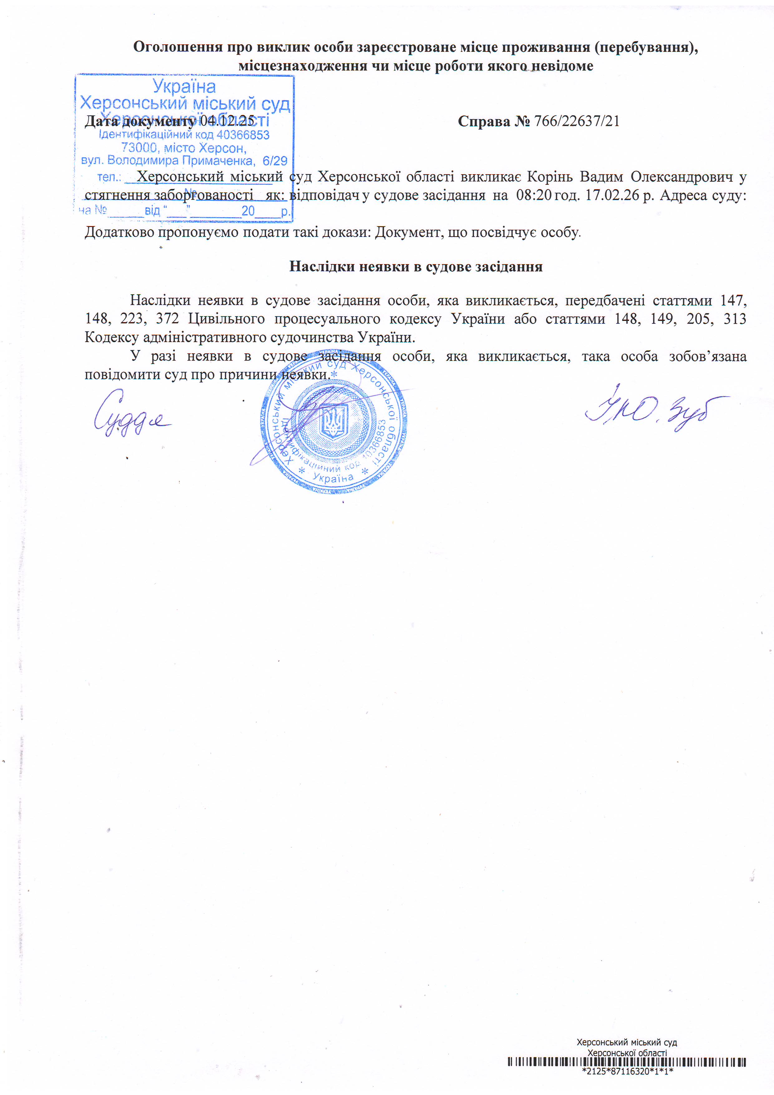 ОГОЛОШЕННЯ ПРО ВИКЛИК ДО СУДУ