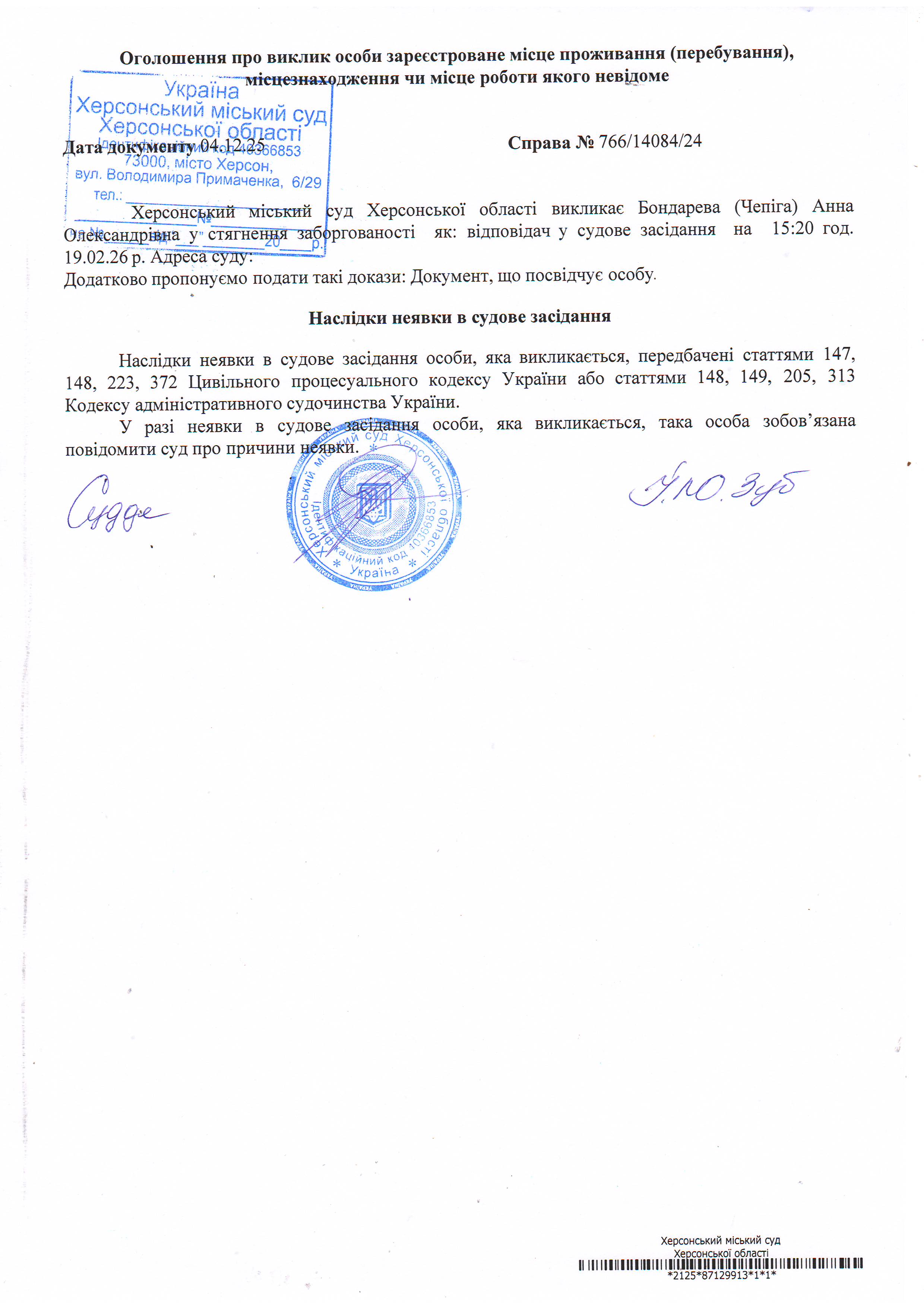 ОГОЛОШЕННЯ ПРО ВИКЛИК ДО СУДУ