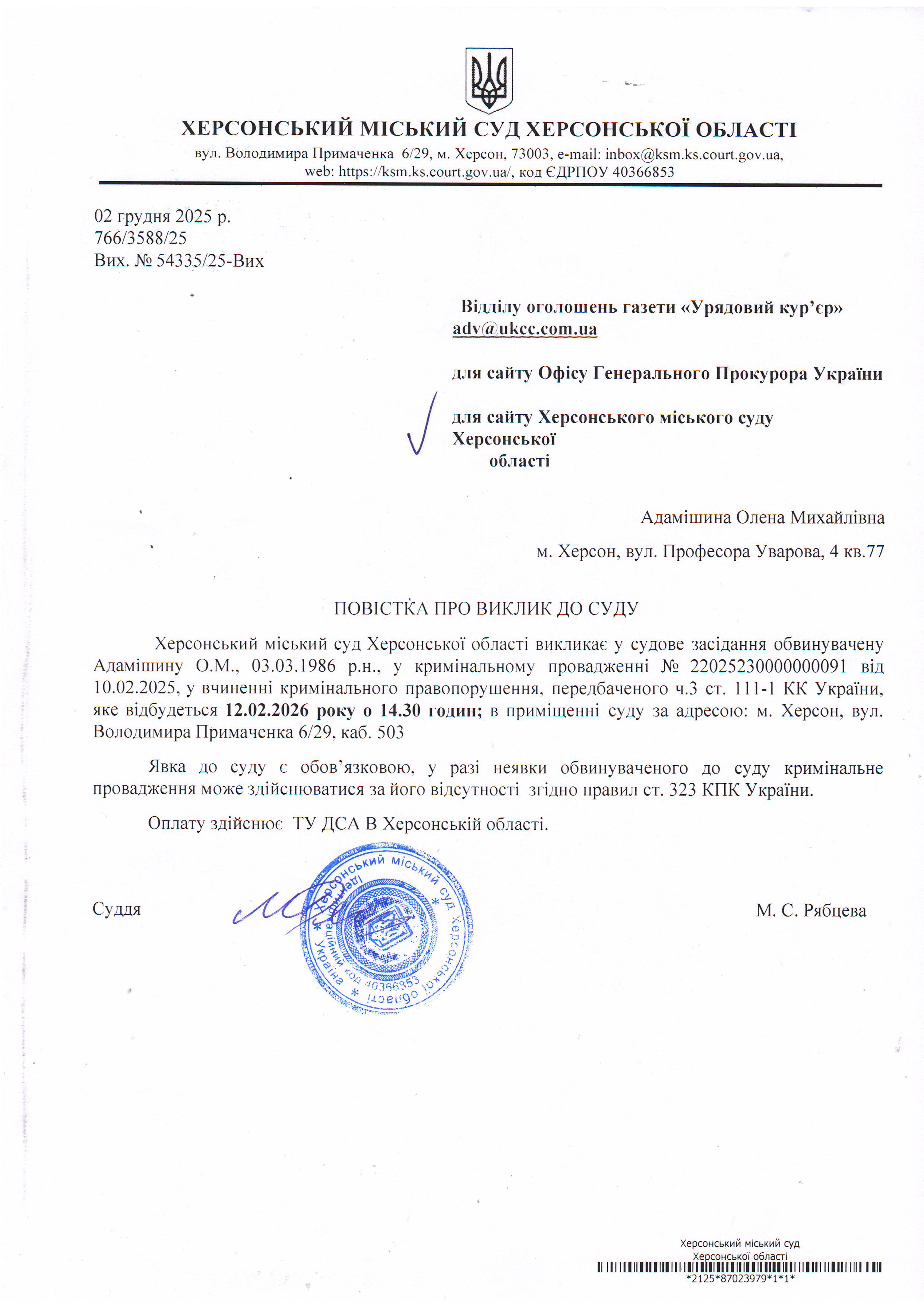 Оголошення про виклик особи в суд та повідомлення про судове рішення
