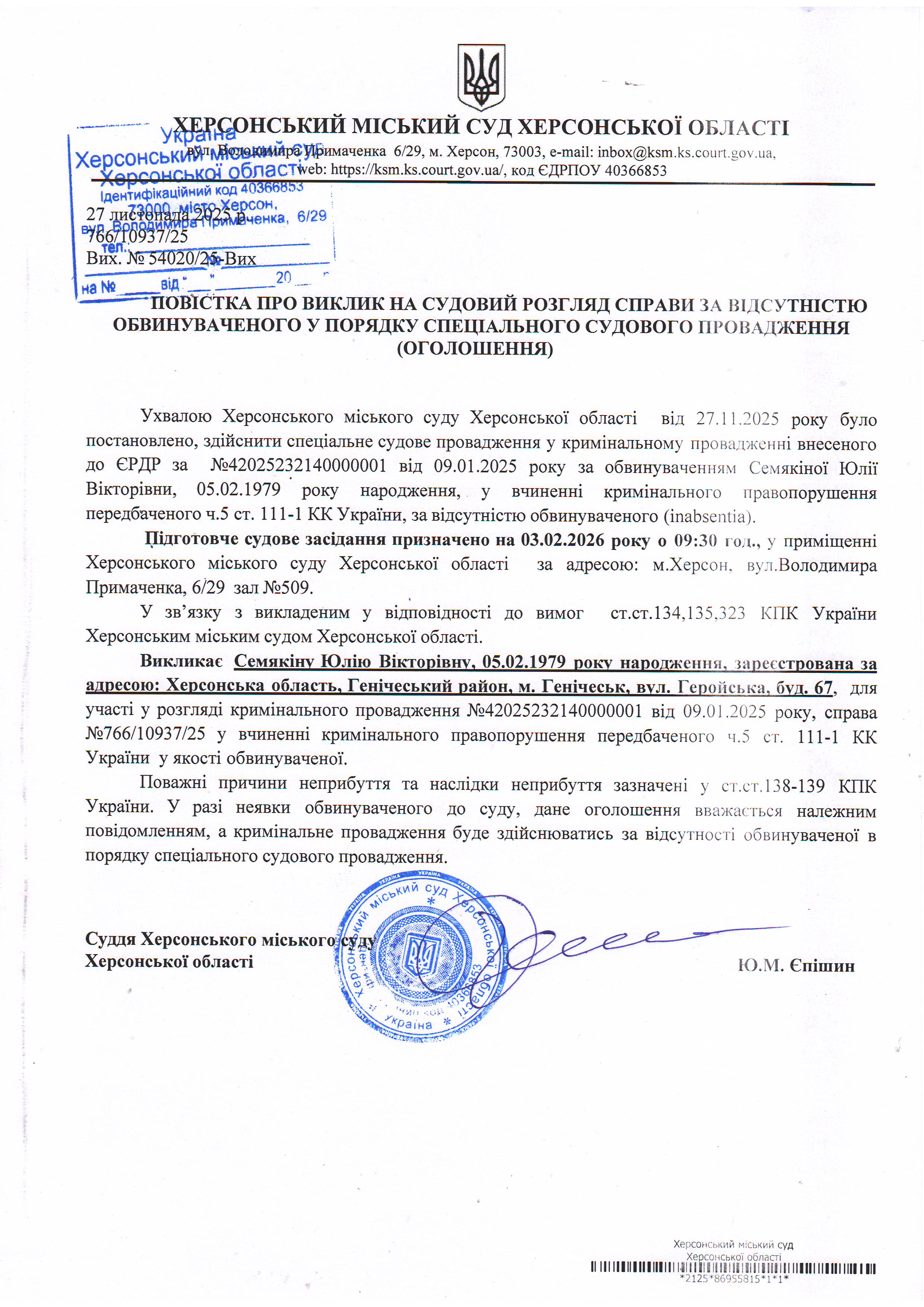 ОГОЛОШЕННЯ ПРО ВИКЛИК ДО СУДУ