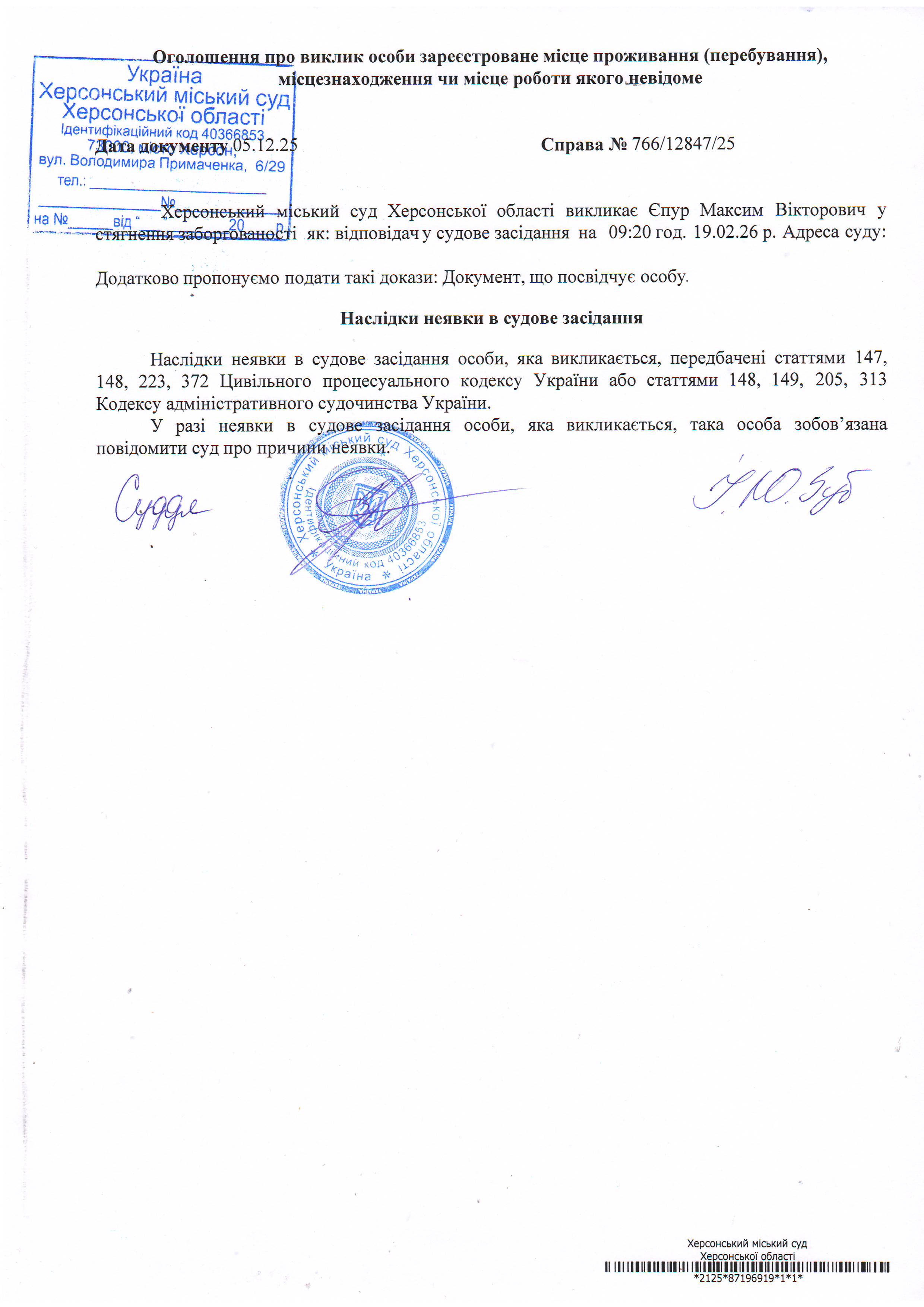 ОГОЛОШЕННЯ ПРО ВИКЛИК ДО СУДУ