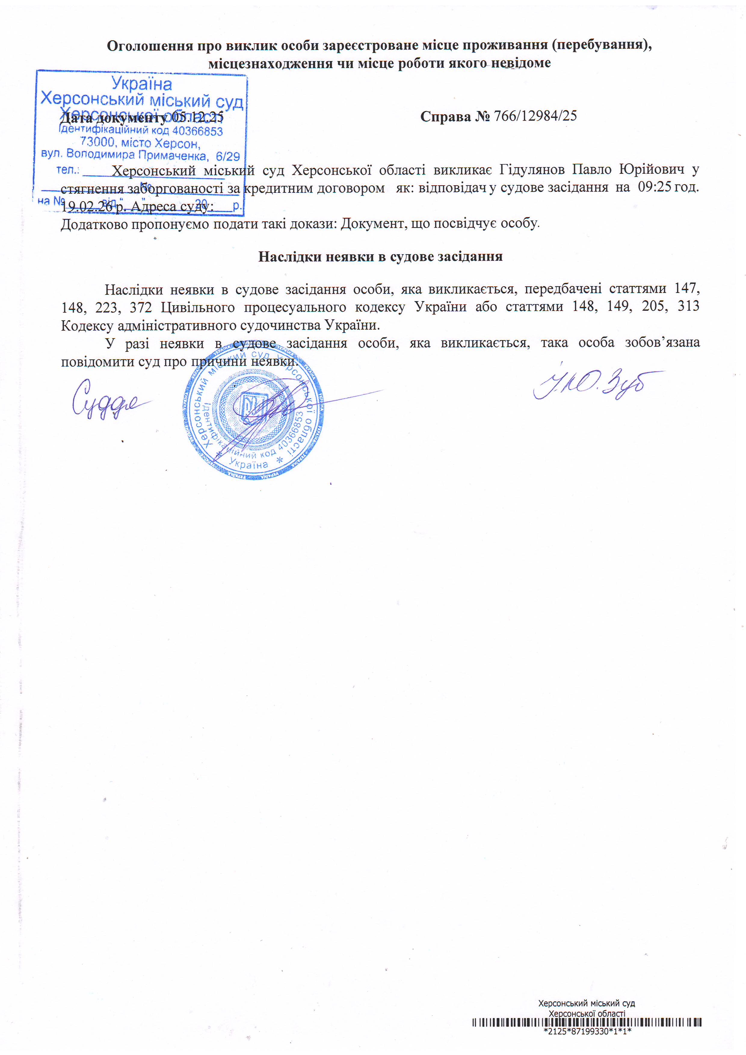 ОГОЛОШЕННЯ ПРО ВИКЛИК ДО СУДУ