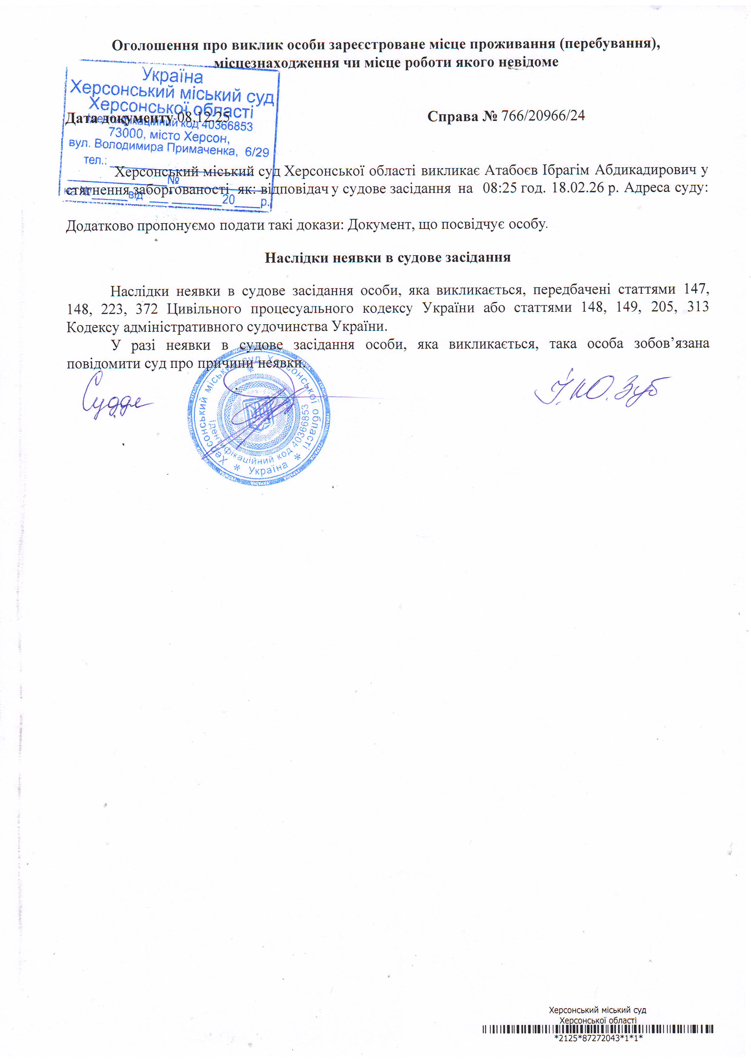 ОГОЛОШЕННЯ ПРО ВИКЛИК ДО СУДУ