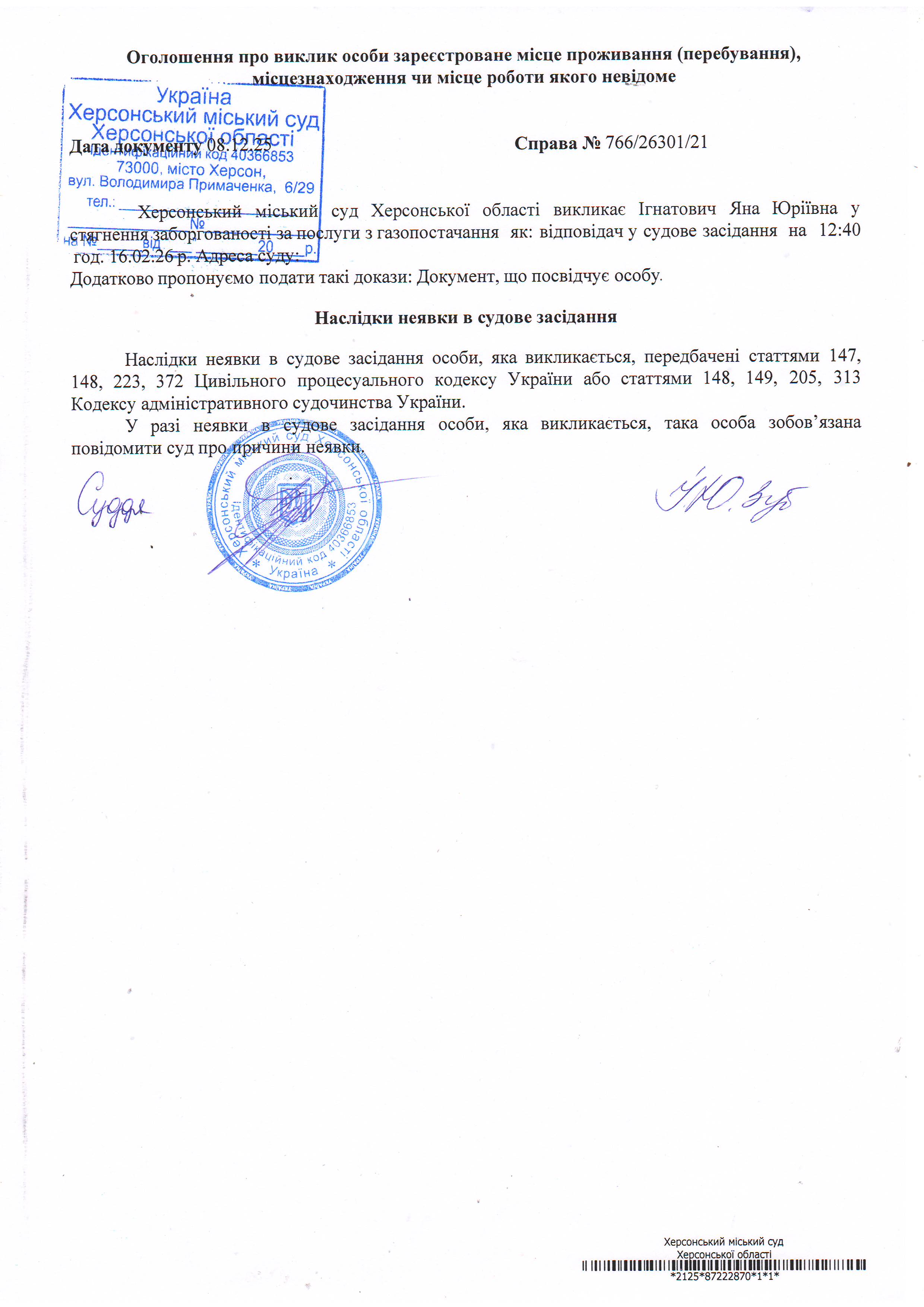 ОГОЛОШЕННЯ ПРО ВИКЛИК ДО СУДУ