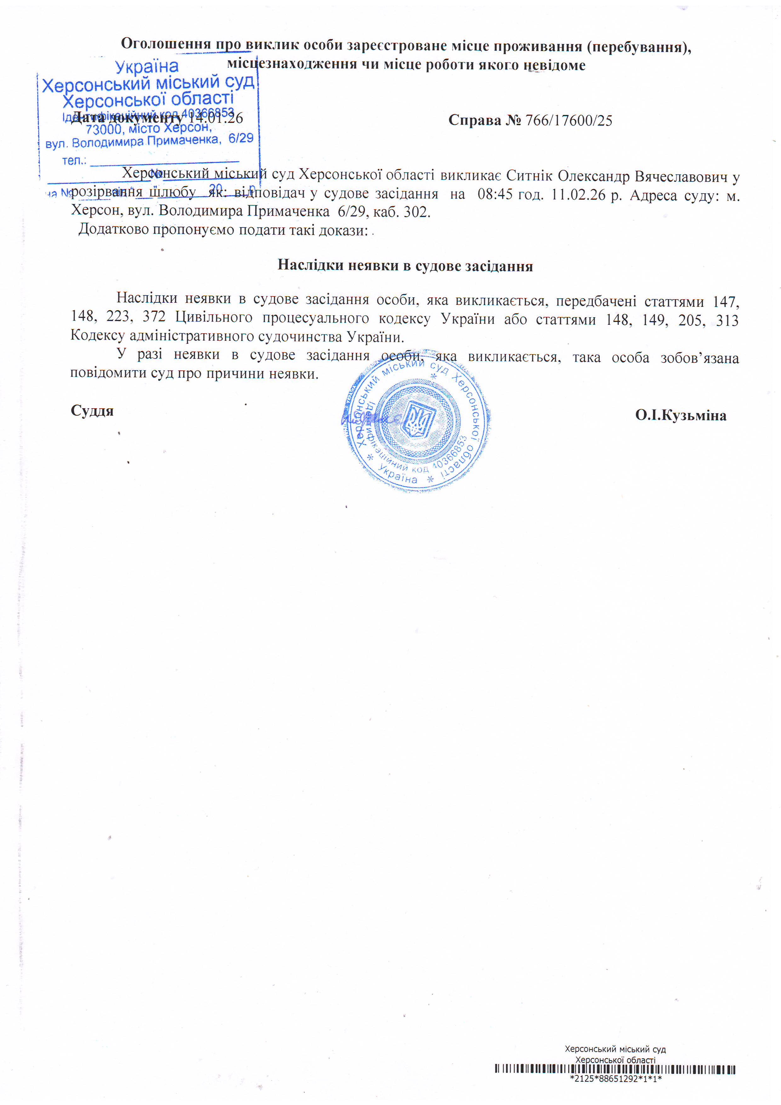 ОГОЛОШЕННЯ ПРО ВИКЛИК ДО СУДУ
