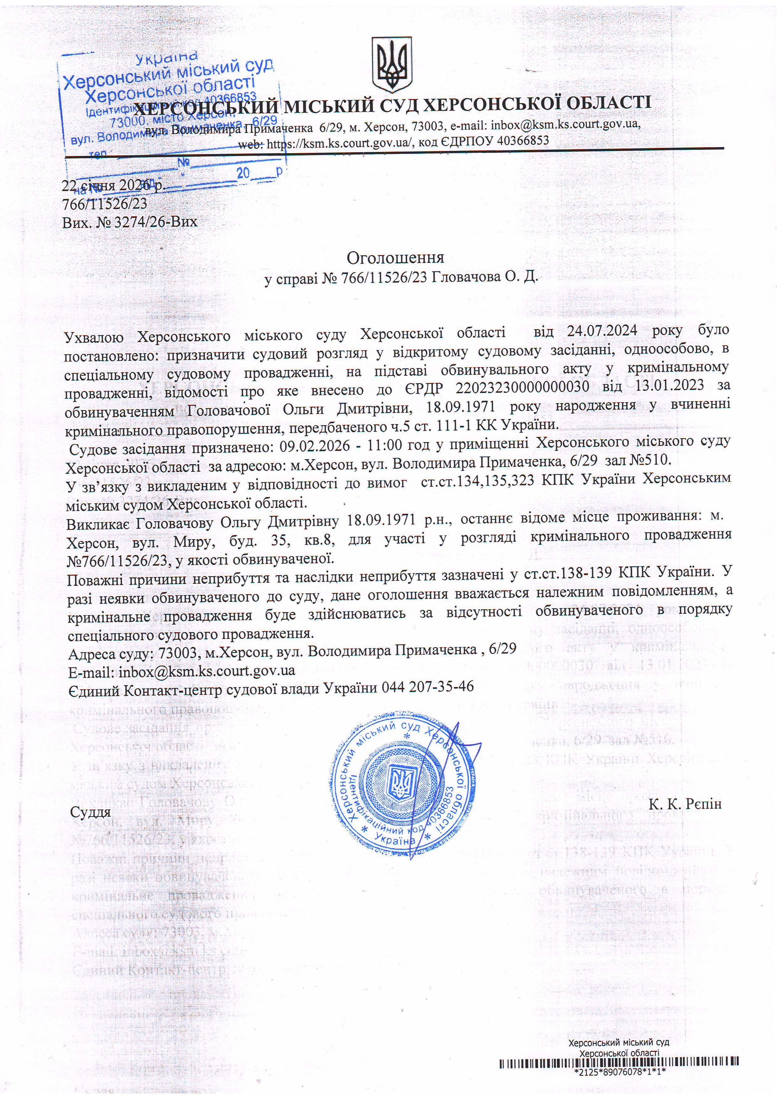 Оголошення про виклик особи в суд та повідомлення про судове рішення