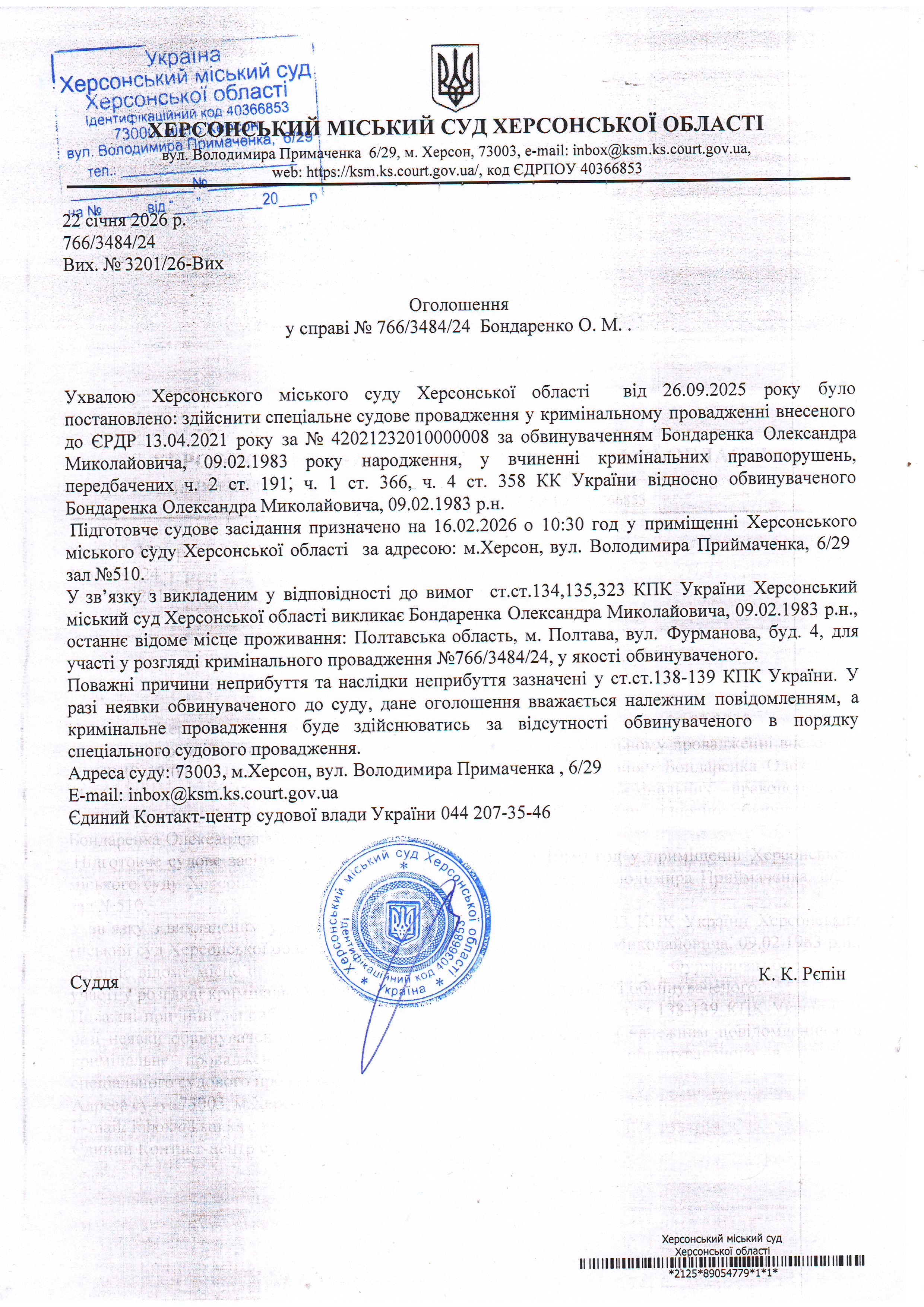 Оголошення про виклик особи в суд та повідомлення про судове рішення