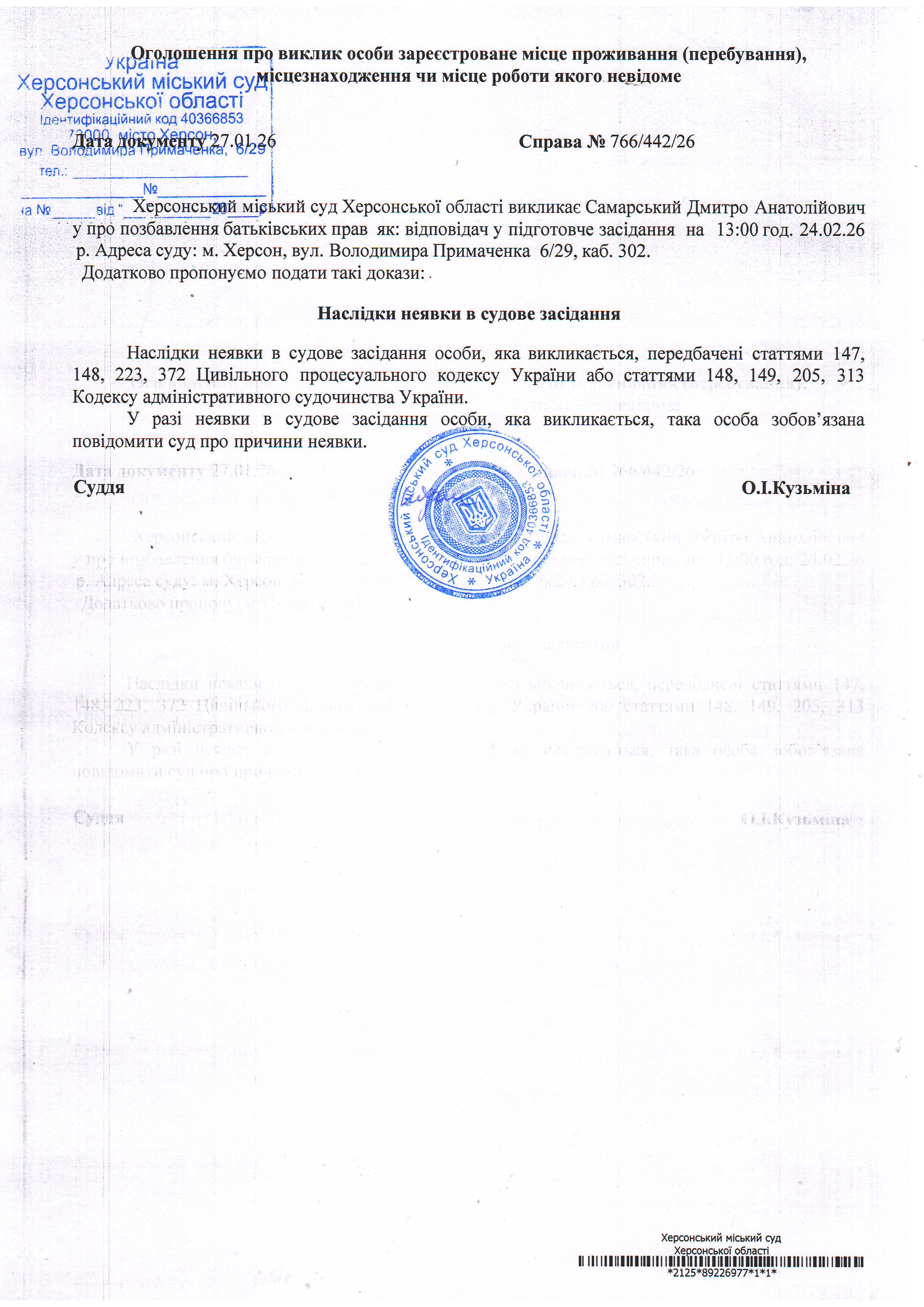 ОГОЛОШЕННЯ ПРО ВИКЛИК ДО СУДУ