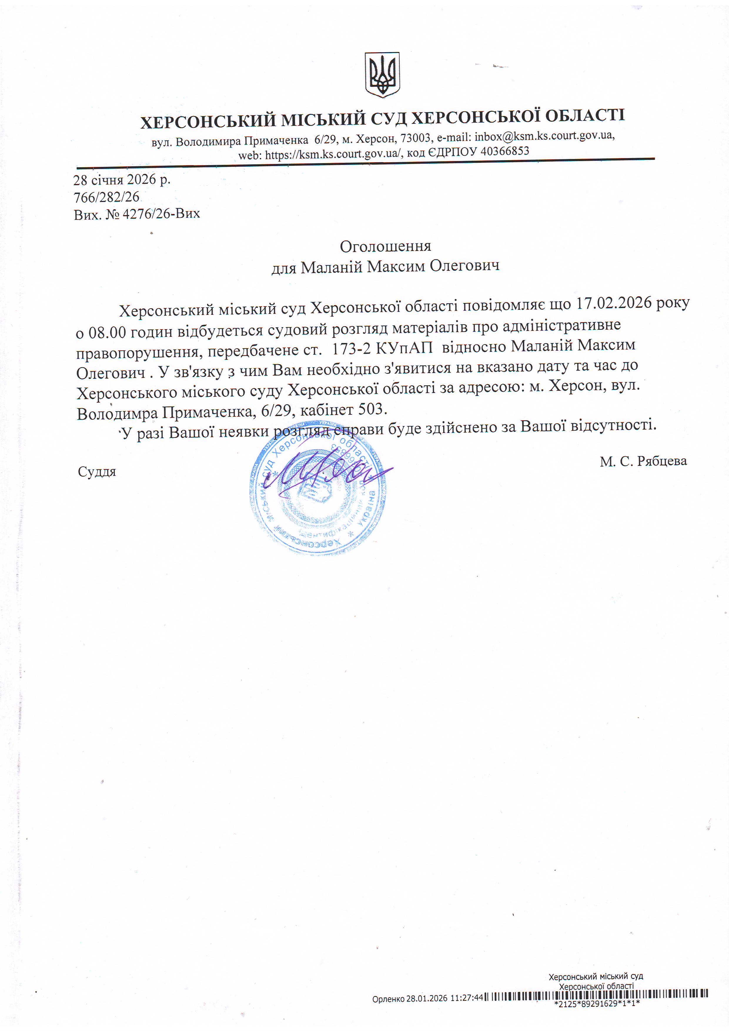 ОГОЛОШЕННЯ ПРО ВИКЛИК ДО СУДУ